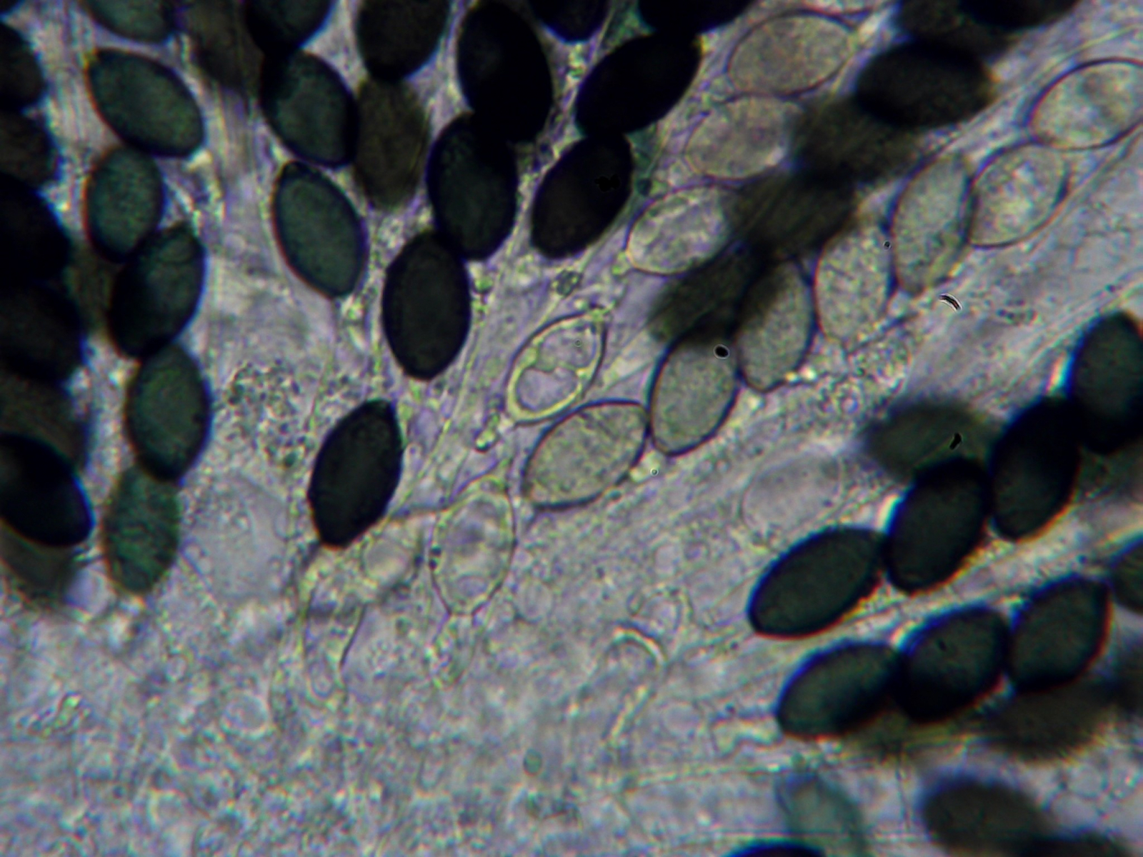 Die Asci sind 8-sporig. Die Sporen sind vermutlich 2-zellig. Herzlichen Dank an alle, die hier im Forum über 1-sporig/2-sporig, Pedizellen und über Arnium/Podospora/Schizothecium geschrieben haben. Ich vermute mal 2-zellig und somit kein Arnium. Auffällig ist bei vielen Sporen ein "Querstrich" den ich als Keimspalte deute??? Sie Sporen sind 16-19 x 13-15 µm. Manche sind andeutungsweise rautenförmig.