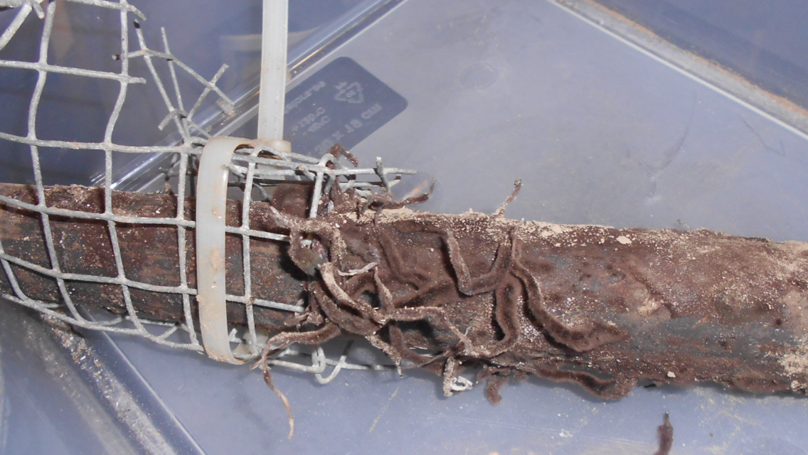 besteht Kenntnis, weshalb der alte Schaufelstiel mit Hasendrahtgitter und Kabelbinder umhüllt ist?