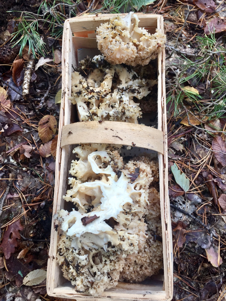 Und dann entdeckte ich tatsächlich eine riesige Krause Glucke am Fuß einer Kiefer. Damit war mein Körbchen prall gefüllt.