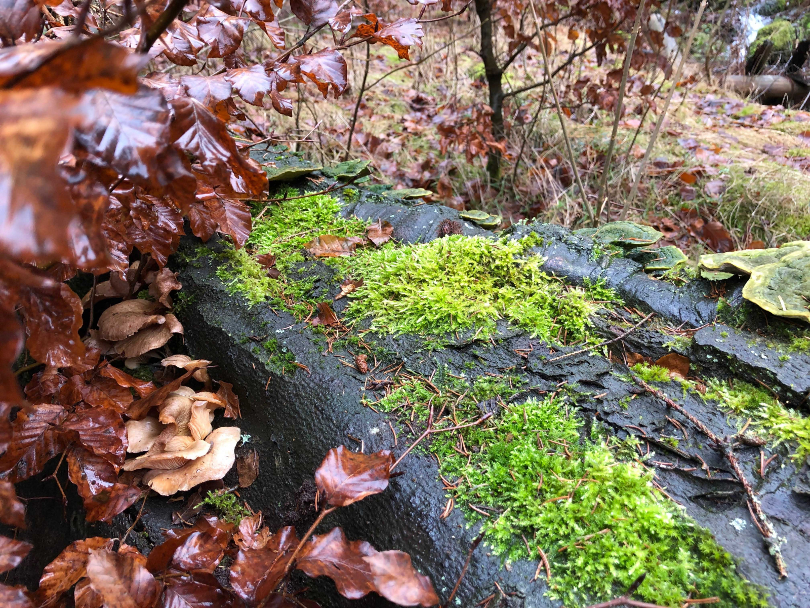 13 Unter den Bäumen, wo der Regen nicht hinkam, liegt sogar noch Schnee. Ganz offenbar handelt es sich bei diesem Schichtpilz? um einen aus der Gattung der Heizpilze, denn auf dem Pilz ist der Schnee geschmolzen. edit: möglicherweise Rötender Runzel-Schichtpilz (Stereum rugosum)