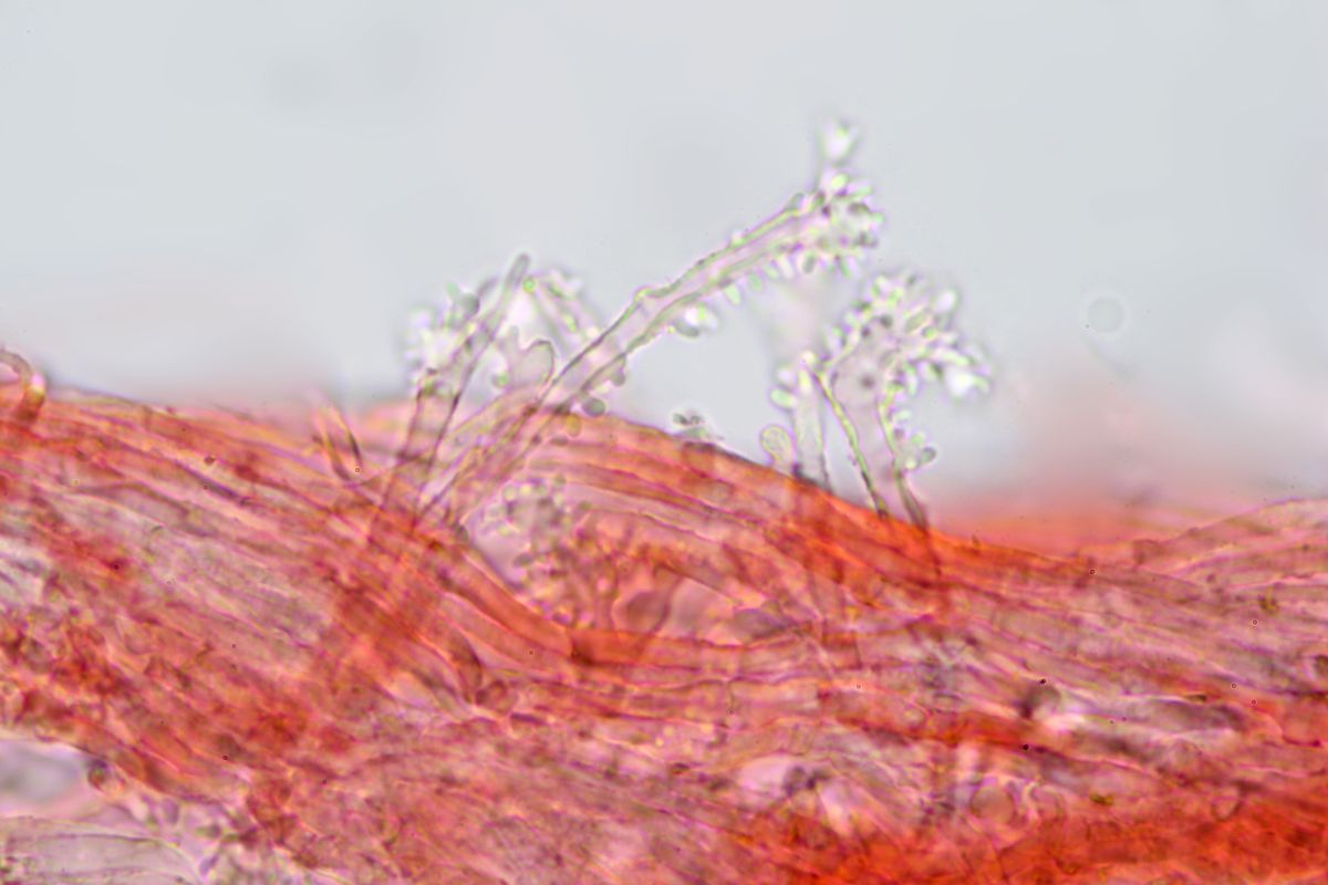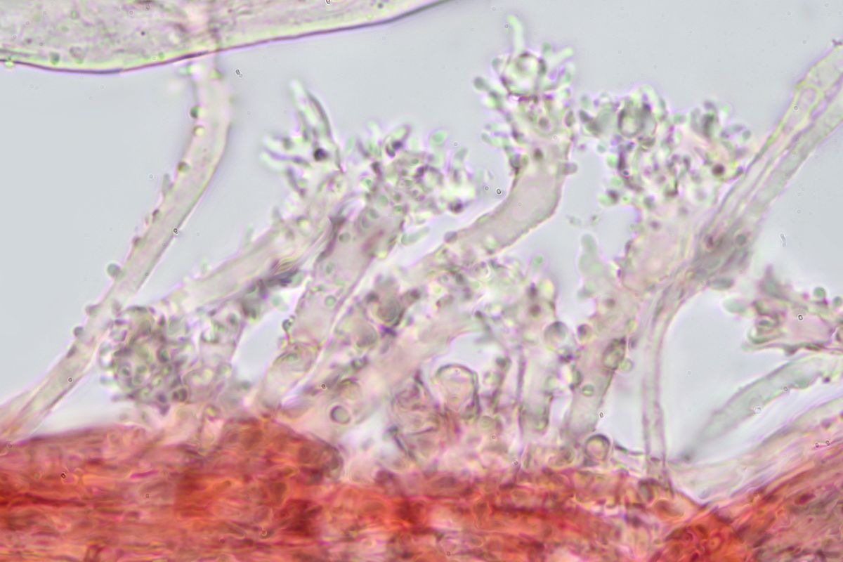 Makroskopisch passt die Hutfarbe und -zeichnung perfekt zu Aronsens Mycena hiemalis (The Genus Mycena), aber da passen sowohl Stielfarbe als auch die Mikros nicht. Ebenfalls ganz gut gefällt mir eigentlich Mycena supina, vor allem weil die Stacheln der Zystiden mir sehr kurz erscheinen, aber da passt die Sporengröße eben nicht (laut Literatur nur 7-9 x 6,5-9 µm. Besser zu der Tatsache, dass es sich um viersporige Basidien handelt (zur Erklärung: Zweisporige Kollektionen haben größere Sporen), passen von der Sporengröße her Mycena meliigena und Mycena pseudocorticola, die ich aber beide kenne und die beide farblich nicht hinhauen. Auch sind mir die Zystiden zu sackartig, vor allem für M. meliigena. Was nun? Ich brauche Hilfe!