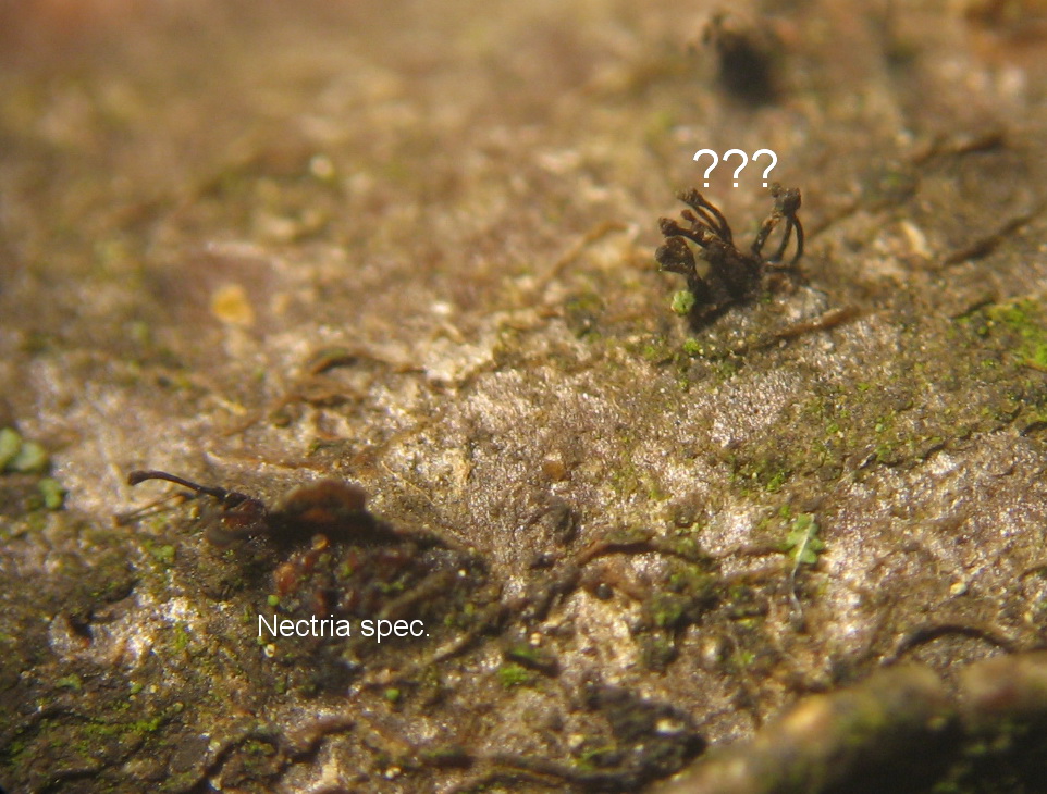 Auf den Resten eines Pyrenomyceten oder evtl. einer Nectria wachsen braune Keulen