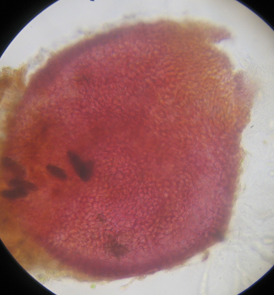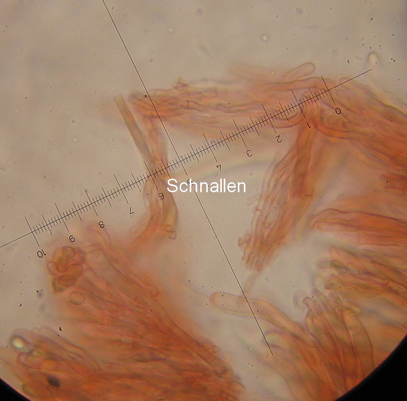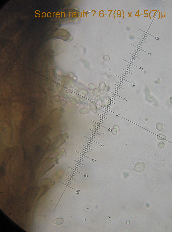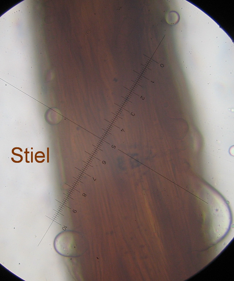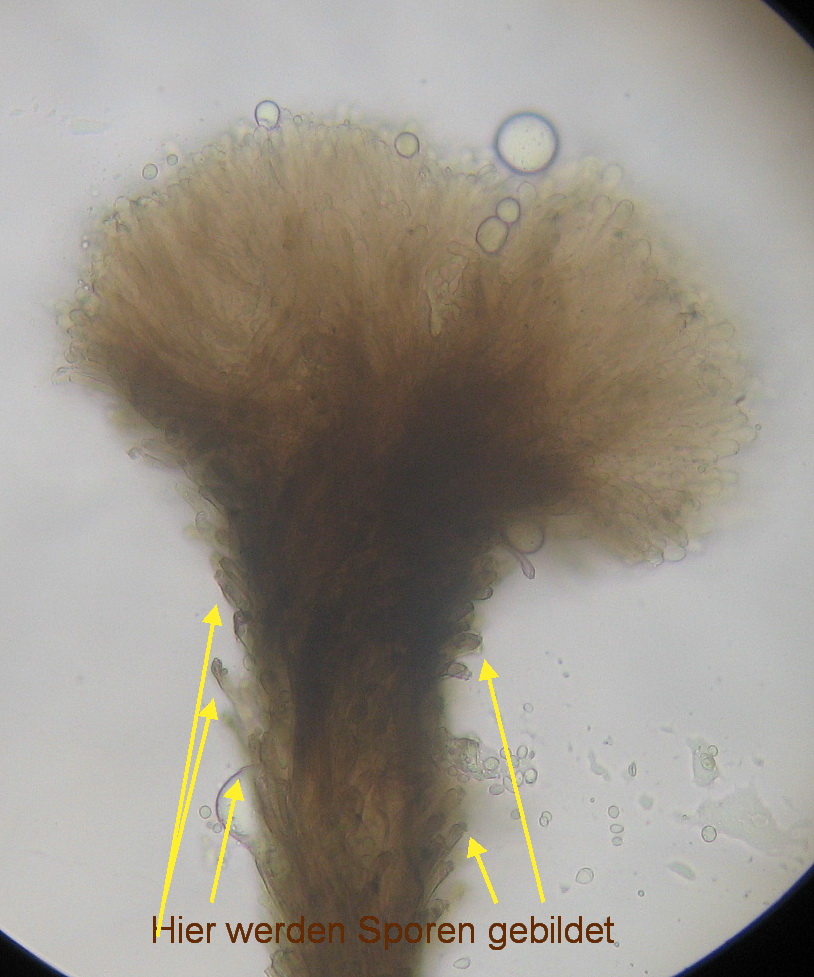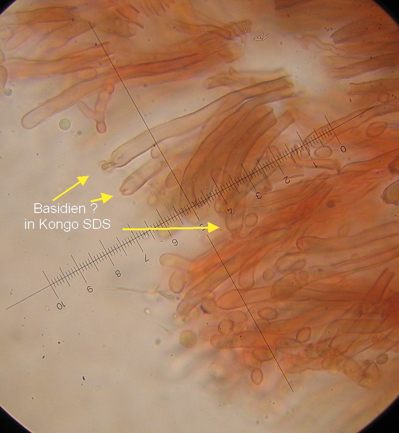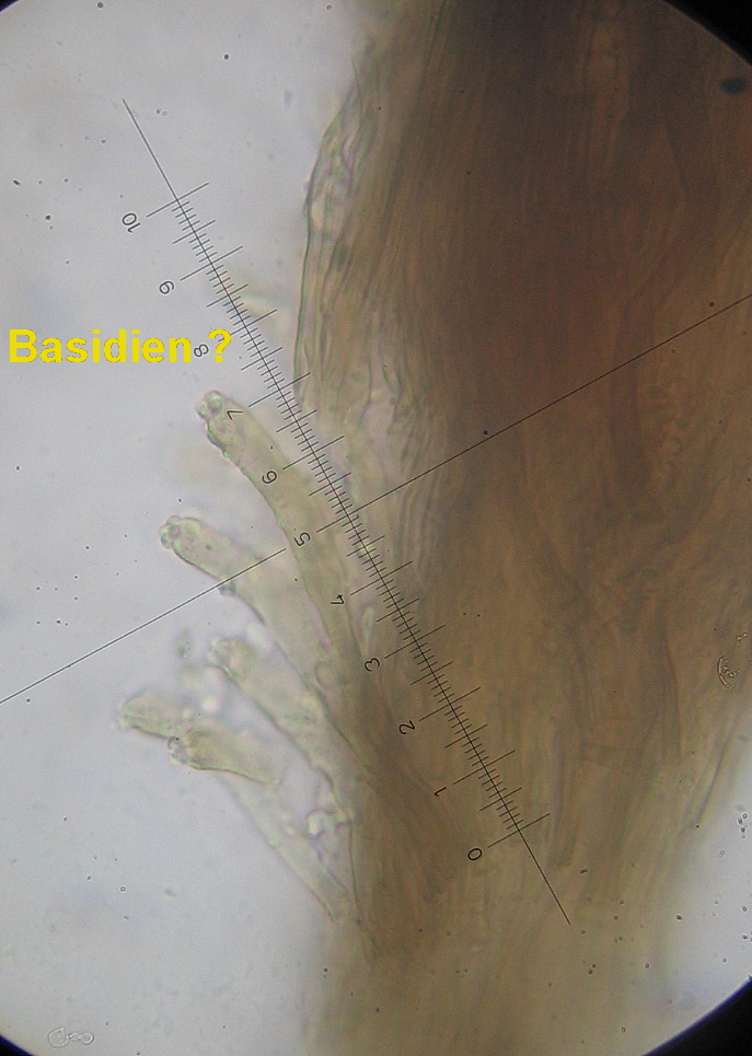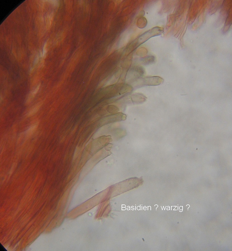 Am Halsteil finden sich dunklere rauh-feinwarzige lange Zellen die den Eindruck einer Basidie hinterlassen, da sich an deren Spitzen meist 4 Papillen / Sterigmen? befinden, und hier auch die meisten Sporen zu sehen waren. Direkt an der Spitze der Keule waren die Hyphenzellen apikal abgerundet ohne diese " Sterigmen"