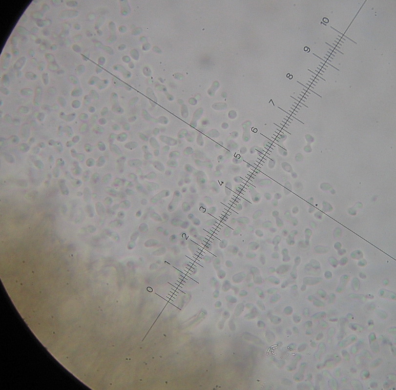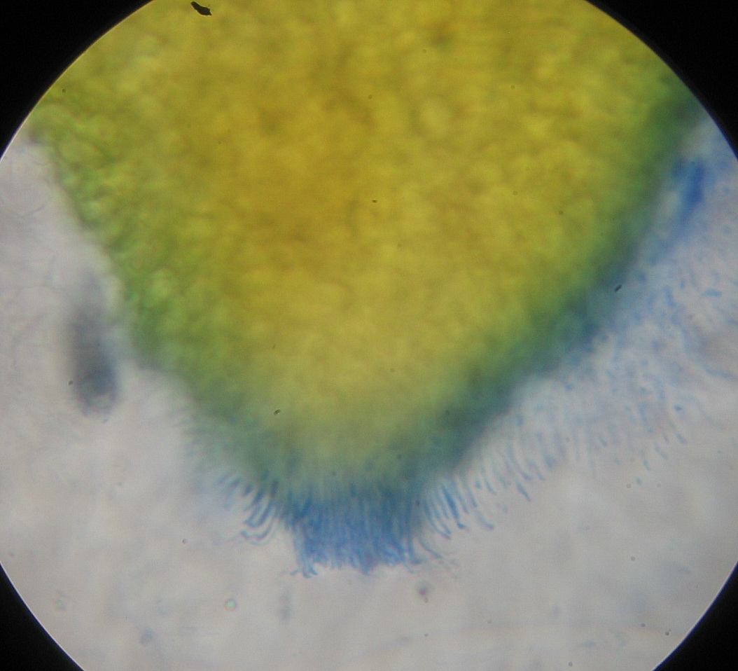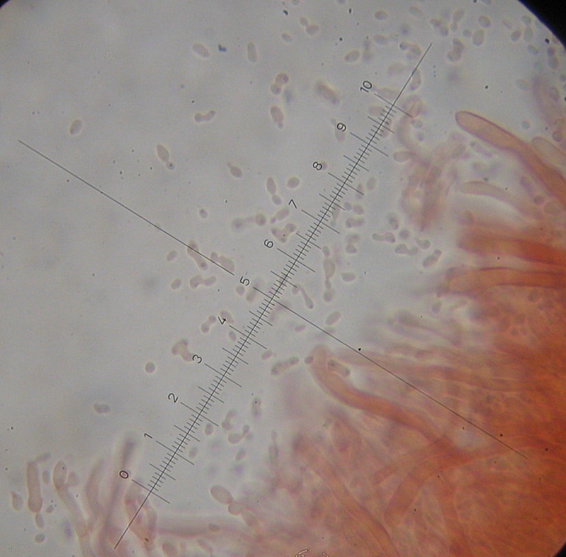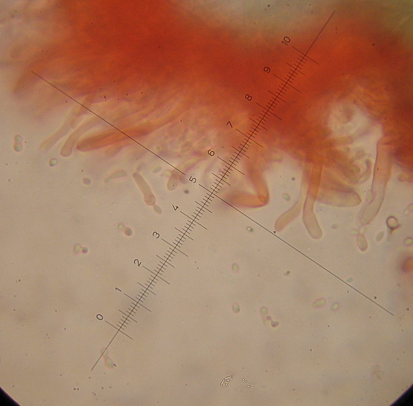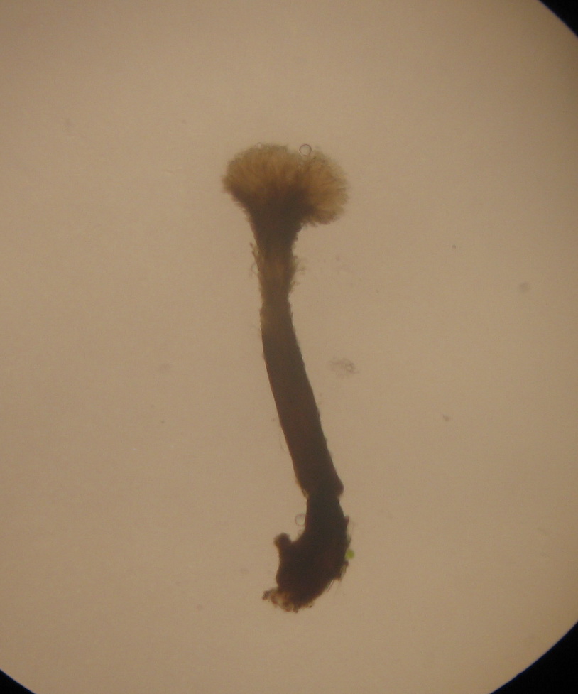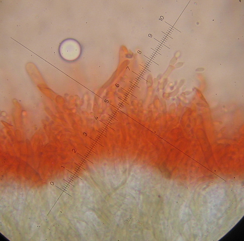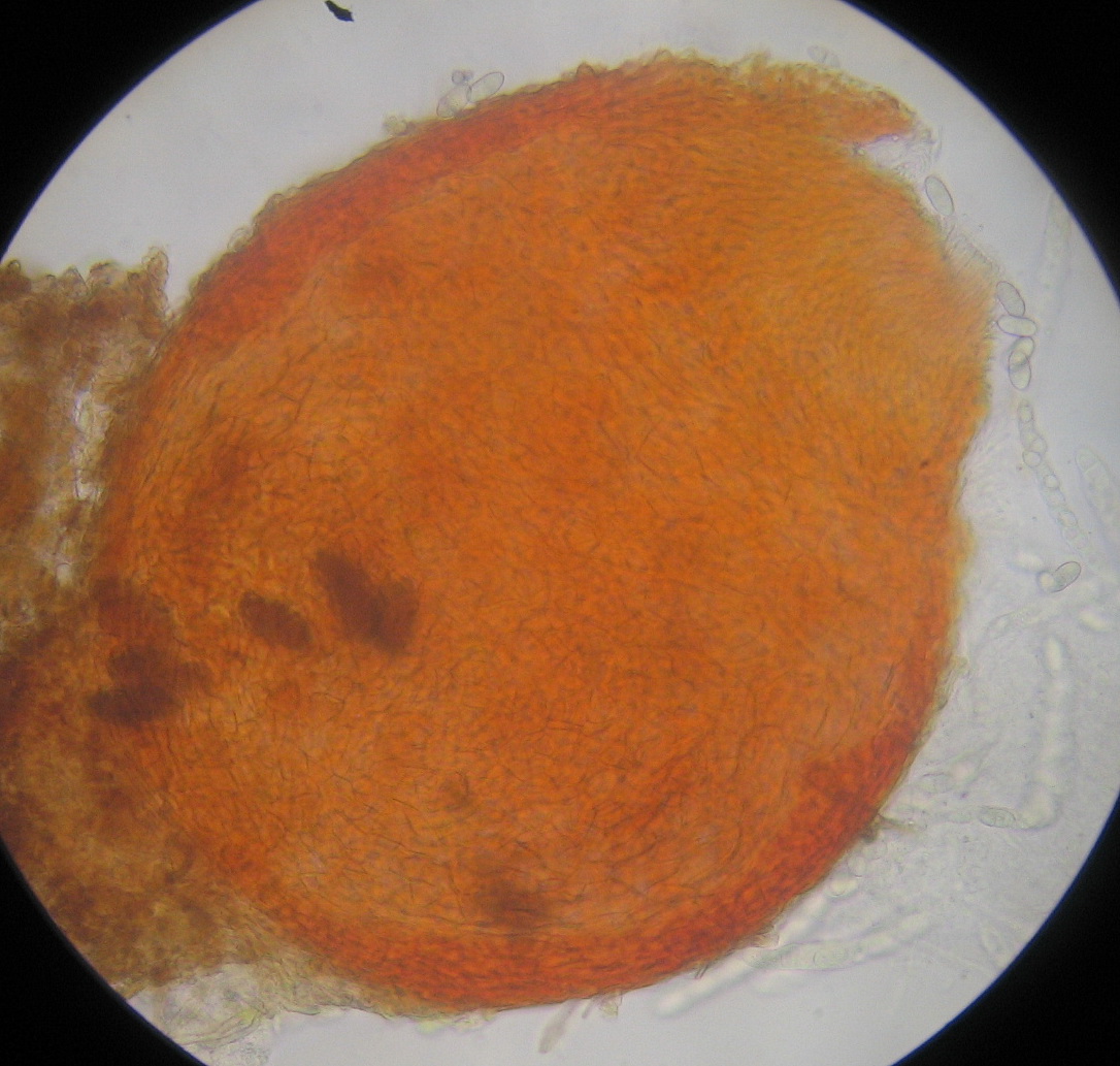 Am Halsteil finden sich dunklere rauh-feinwarzige lange Zellen die den Eindruck einer Basidie hinterlassen, da sich an deren Spitzen meist 4 Papillen / Sterigmen? befinden, und hier auch die meisten Sporen zu sehen waren. Direkt an der Spitze der Keule waren die Hyphenzellen apikal abgerundet ohne diese " Sterigmen"