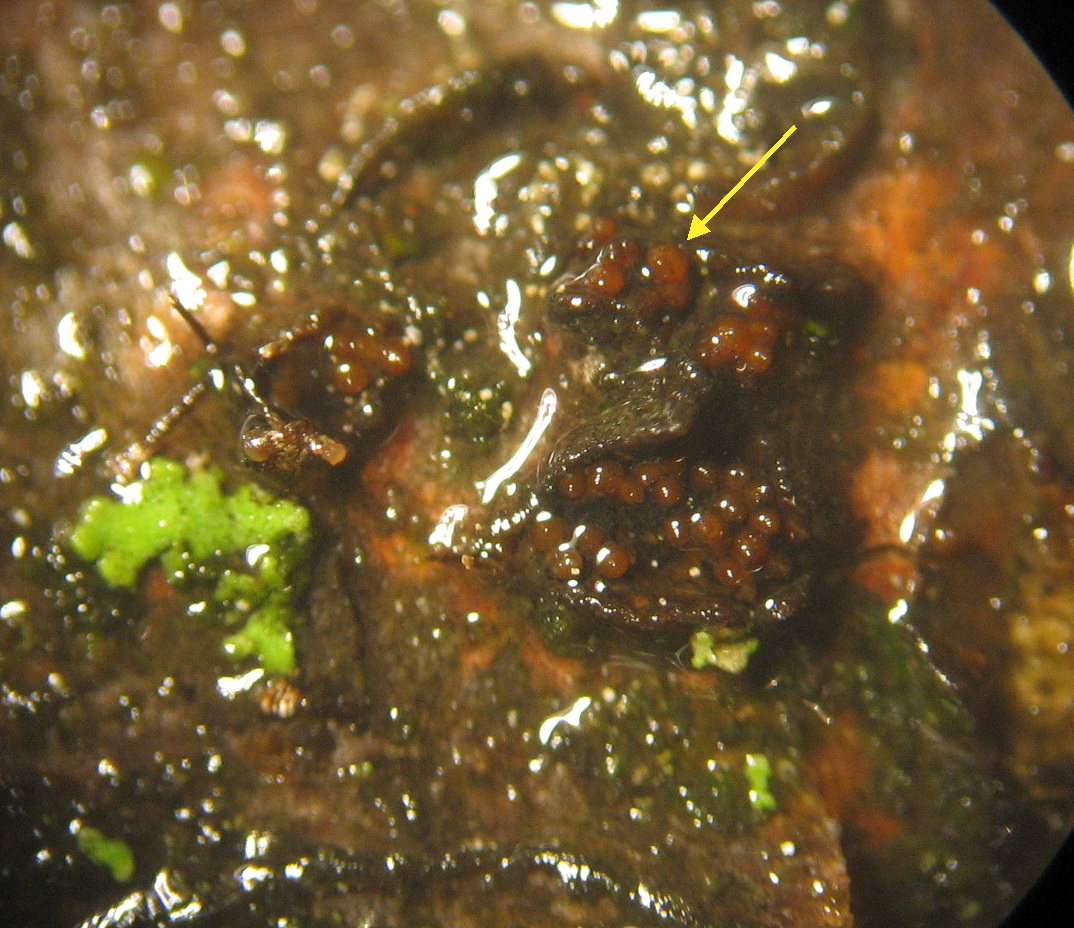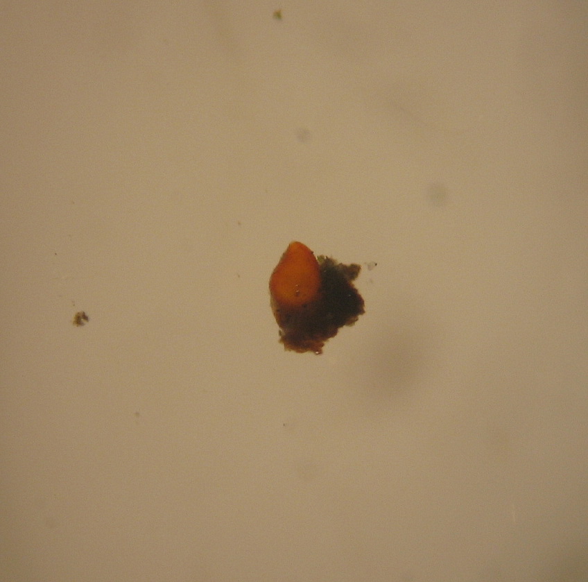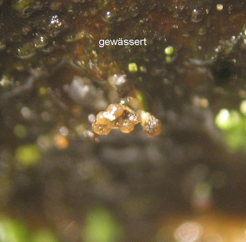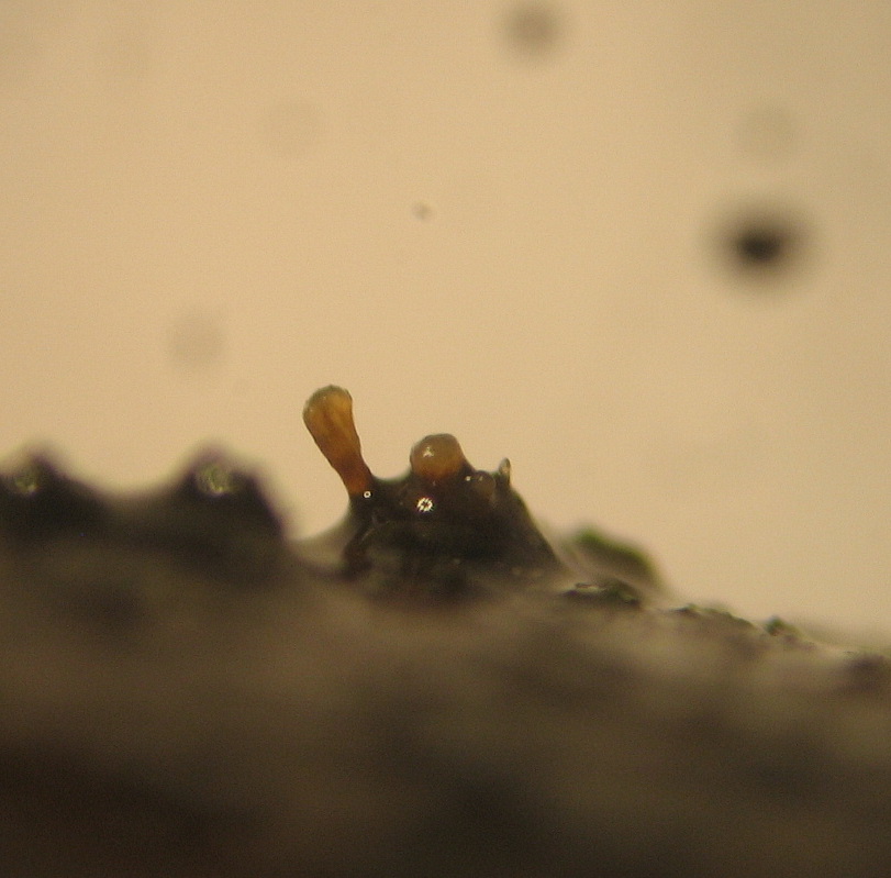 Verteilt auftretende, einzelne oder in Gruppen wachsende apikal verbreiterte, braune "Stäbchen" meist so um 1mm hoch und apikal 0,1-0,2mm breit.