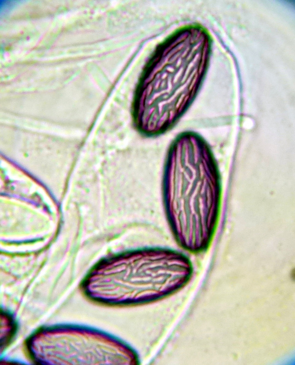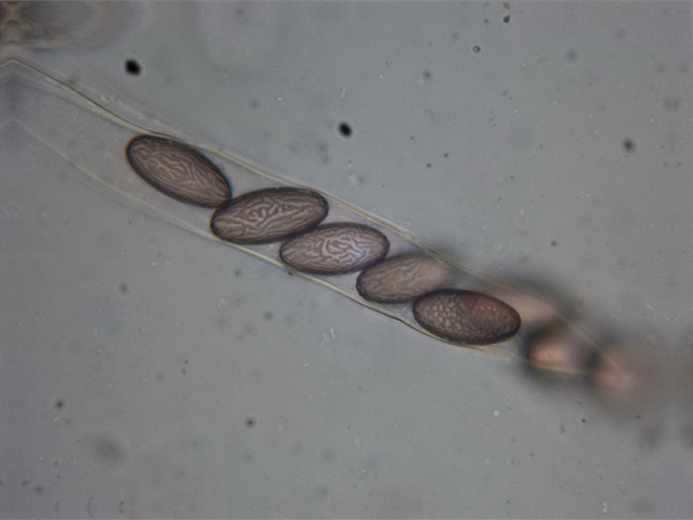 In meinen Unterlagen habe ich soeben Notizen gefunden, wo ich in einem Ascus 6 "normale" Sporen sowie je eine retikulate und eine isoliert warzige erwähne, und diese entsprechen skizziert habe. In einem anderen Ascus dieser Aufsammlung fand ich 4 retikulate und 4 warzige Sporen!