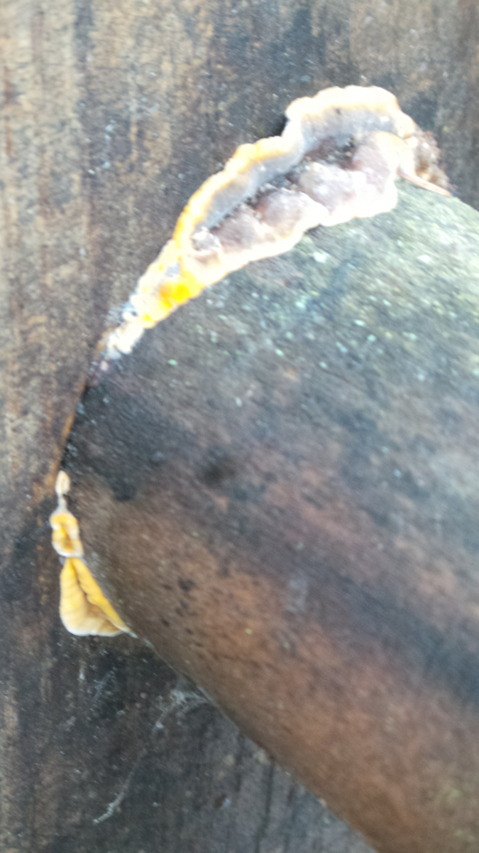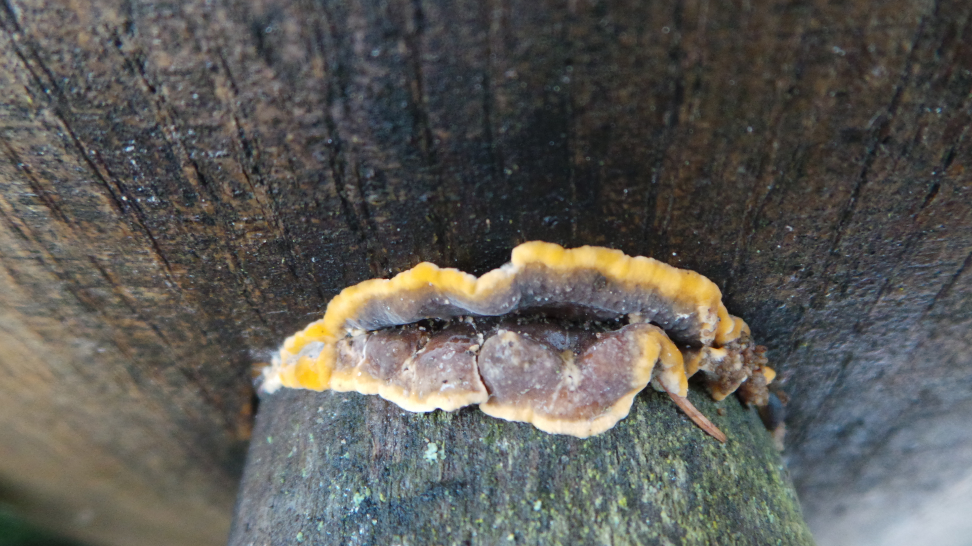 Eiche ist übrigens auch das Lieblingssubstrat von Stereum hirsutum (Striegeliger Schichtpilz), der auch jung oft resupinat wächst. Mit den leuchtenden Gelbtönen an den Rändern wäre das die Art, die ich am ehesten vermuten würde.LG, Pablo.