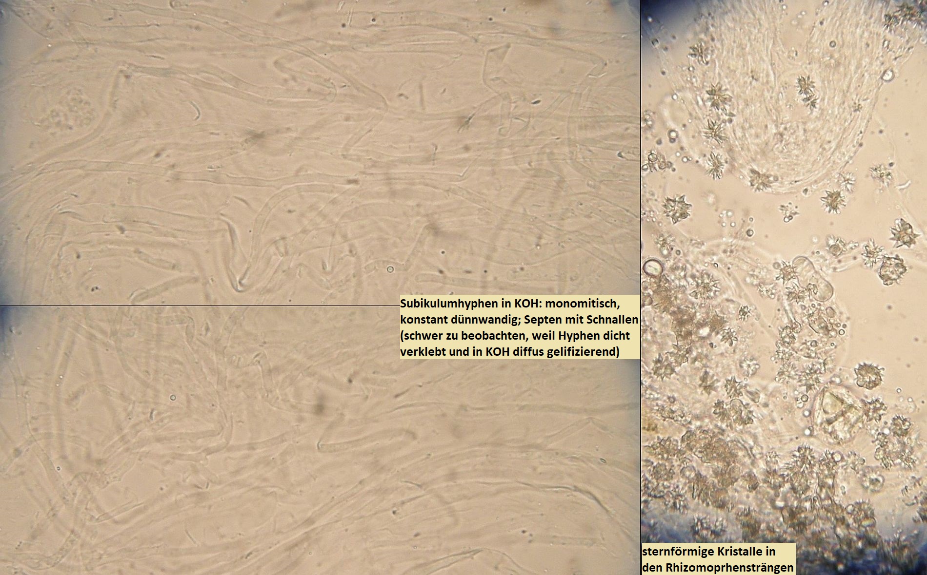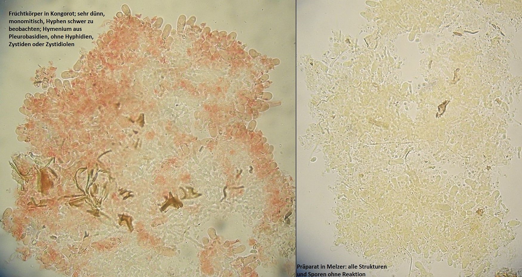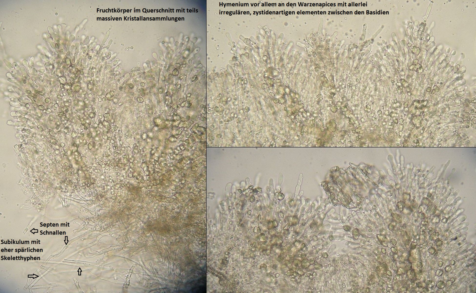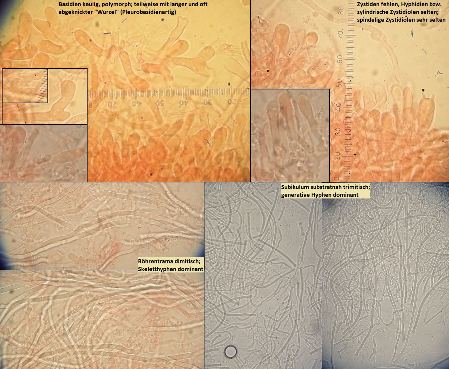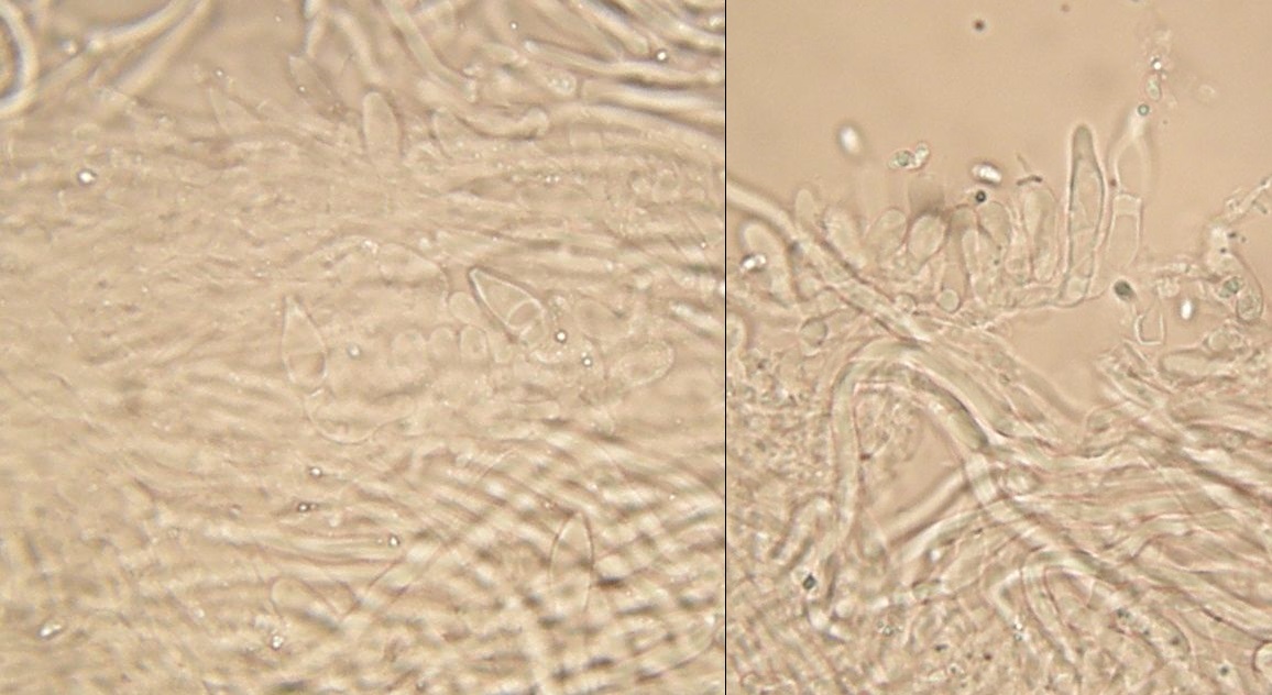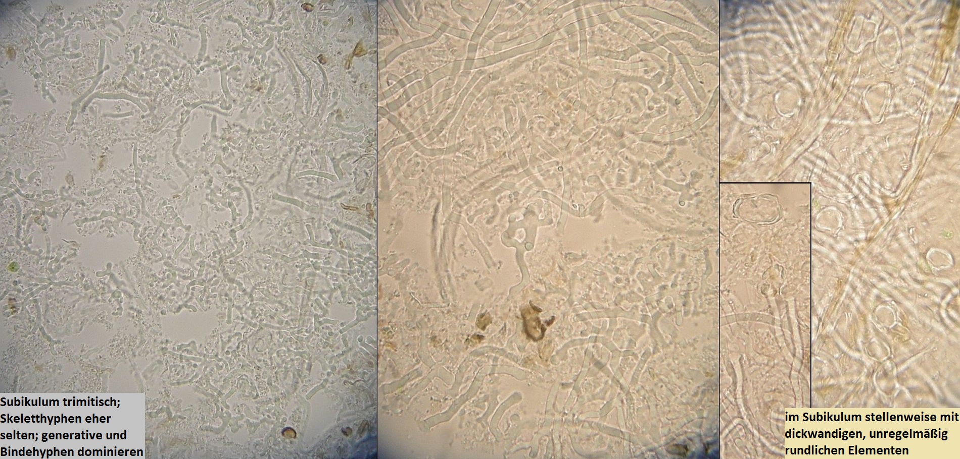 Müsste eigentlich schon hinkommen, wenn das tatsächlich die richtigen zystiden sind und sich die Skeletthyphen in den Rhizomorphen einfach gut versteckt haben, so daß ich die nicht nachweisen konnte.