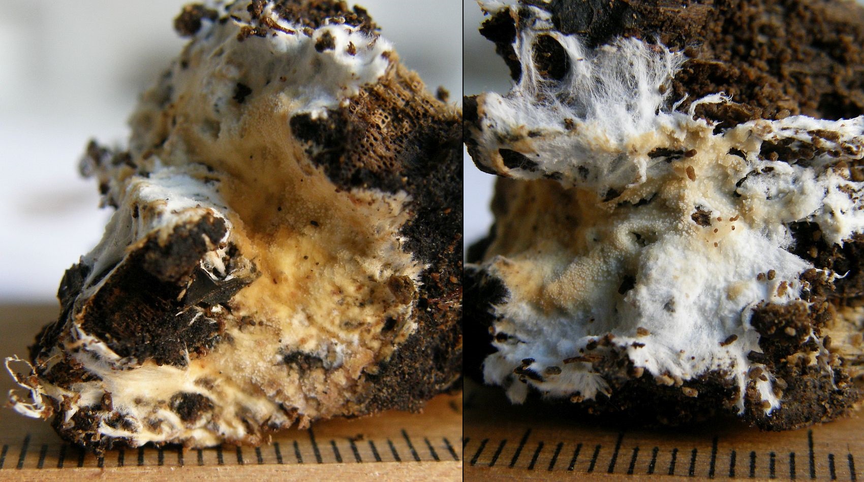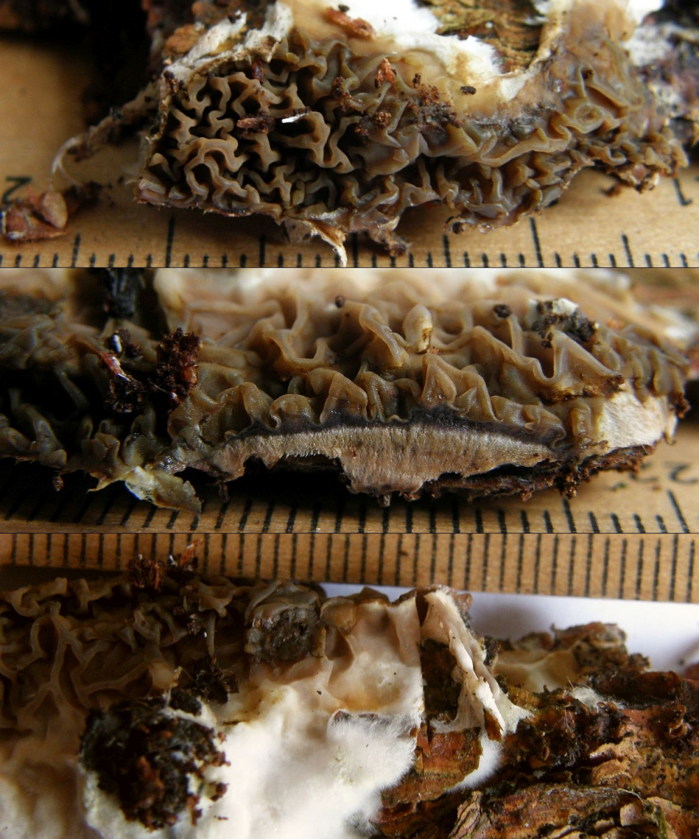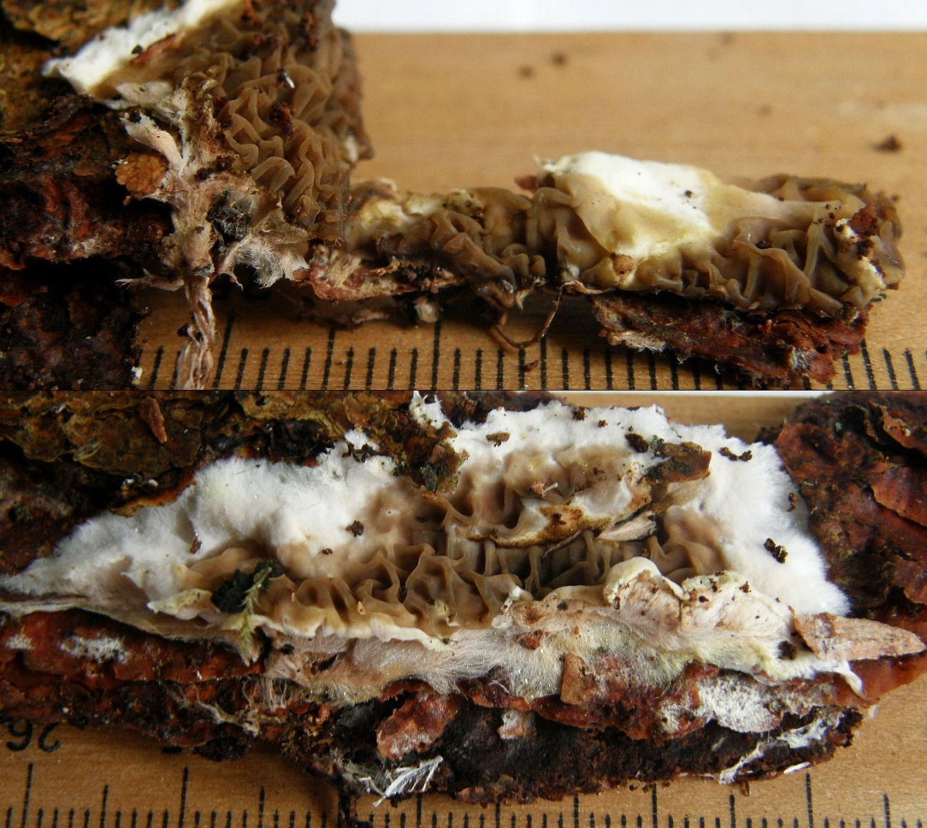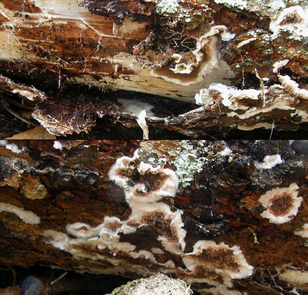 Jedenfalls nenne ich das erstmal Serpula himantioides, wüsste dann aber nicht mehr, wie man solche Kolletionen von Leucogyrophana pulverulenta unterscheiden könnte.