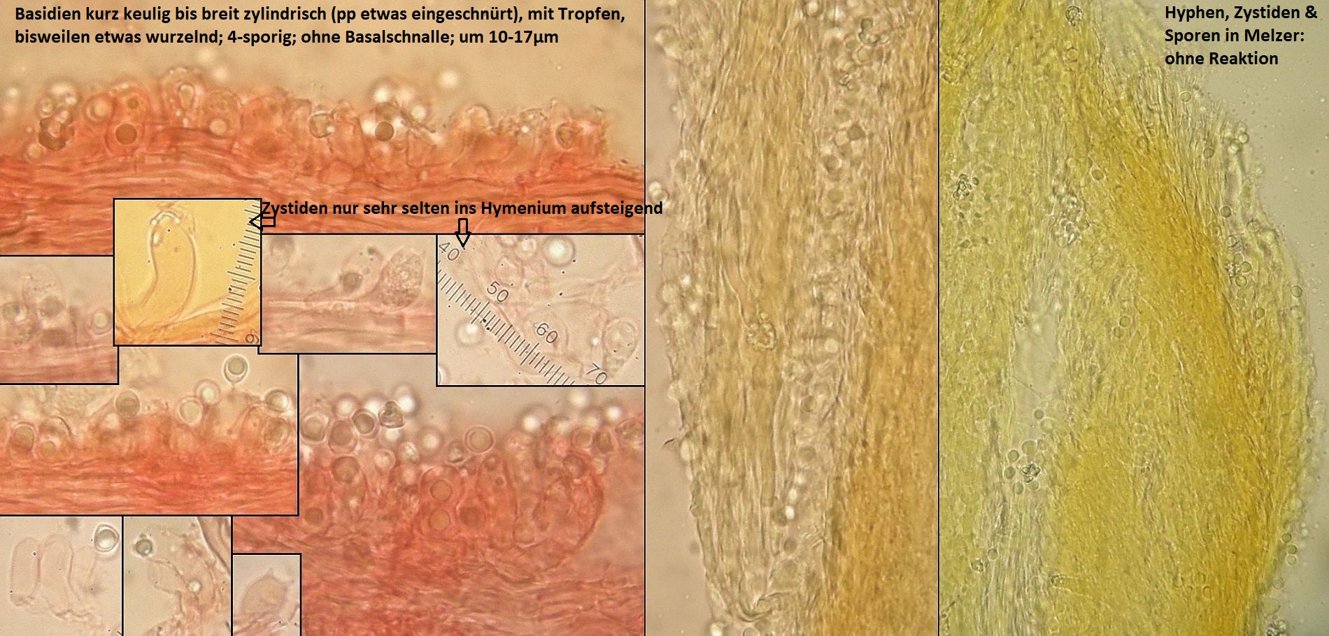 Hatte ich eigenltich schon als Aphanobasidium pseudotsugae abgelegt, aber im Nachinein erschienen die Sporen doch ein wenig abweichend (minimal länglicher), und die Basidien sind kurz, was dann auch zu Aphanobasidium subnitens führen könnte. Was Elia Martini >dazu abbildet<, könnte schon auch passen.