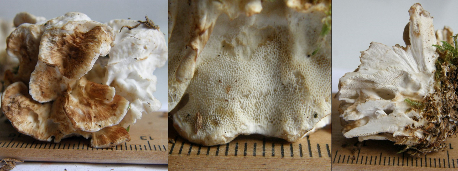 ---> heißt weiterhin Serpula himantioides, Sporen sind so schon zu groß für Leucogyrophana pulverulenta und bei juvenilen Kollektionen von S. himantioides sucht man Skeletthyphen wohl oft vergeblich.