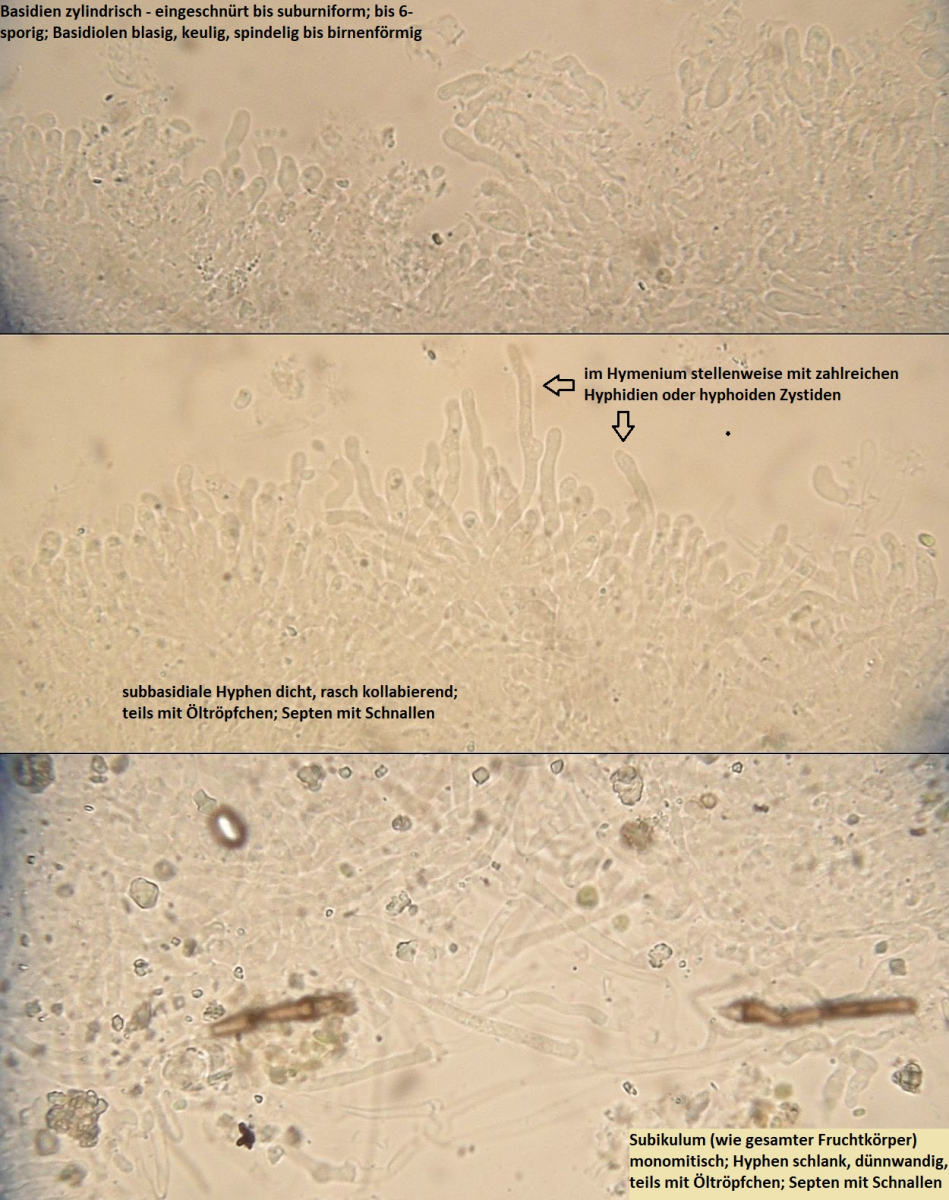 Der Fruchtkörper ist ziemlich jung, hat aber schon reichlich Sporen und im Subikulum ziemlich auffallende, schlanke Skeletthyphen. Damit komme ich zu Fibricium, und wenn ich die zystiden weginterpretiere, dann wäre ich bei Fibricium subceraceum. Was schön passen würde, aber eigenltich würde ich einige Elelemte gerade im Bereich der Warzen doch lieber als Zystiden interpretieren.