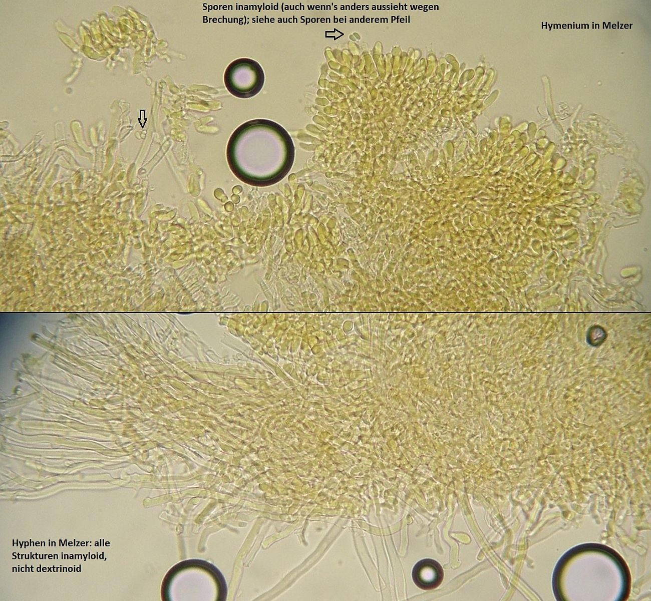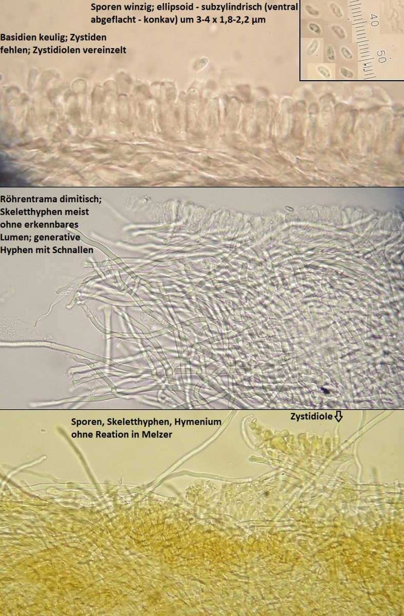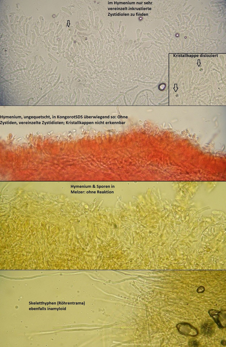 Müsste eigentlich schon hinkommen, wenn das tatsächlich die richtigen zystiden sind und sich die Skeletthyphen in den Rhizomorphen einfach gut versteckt haben, so daß ich die nicht nachweisen konnte.