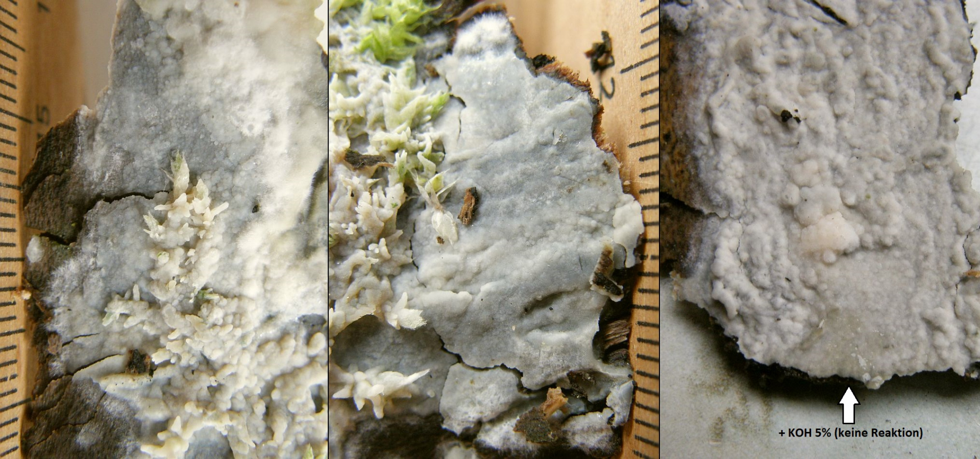 Aber ob das wirklich ein tragbares Trennmerkmal ist? Oder vielleicht auch reife- bzw. wetterabhängig? Immerhin fand ich dieses Aphanobasidium cf pseudotsugae zu einer Zeit, als der Sommer schon damit beganan, alles Leben aus den Wäldern zu brutzeln.