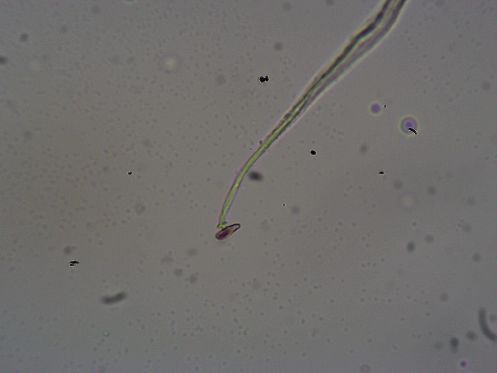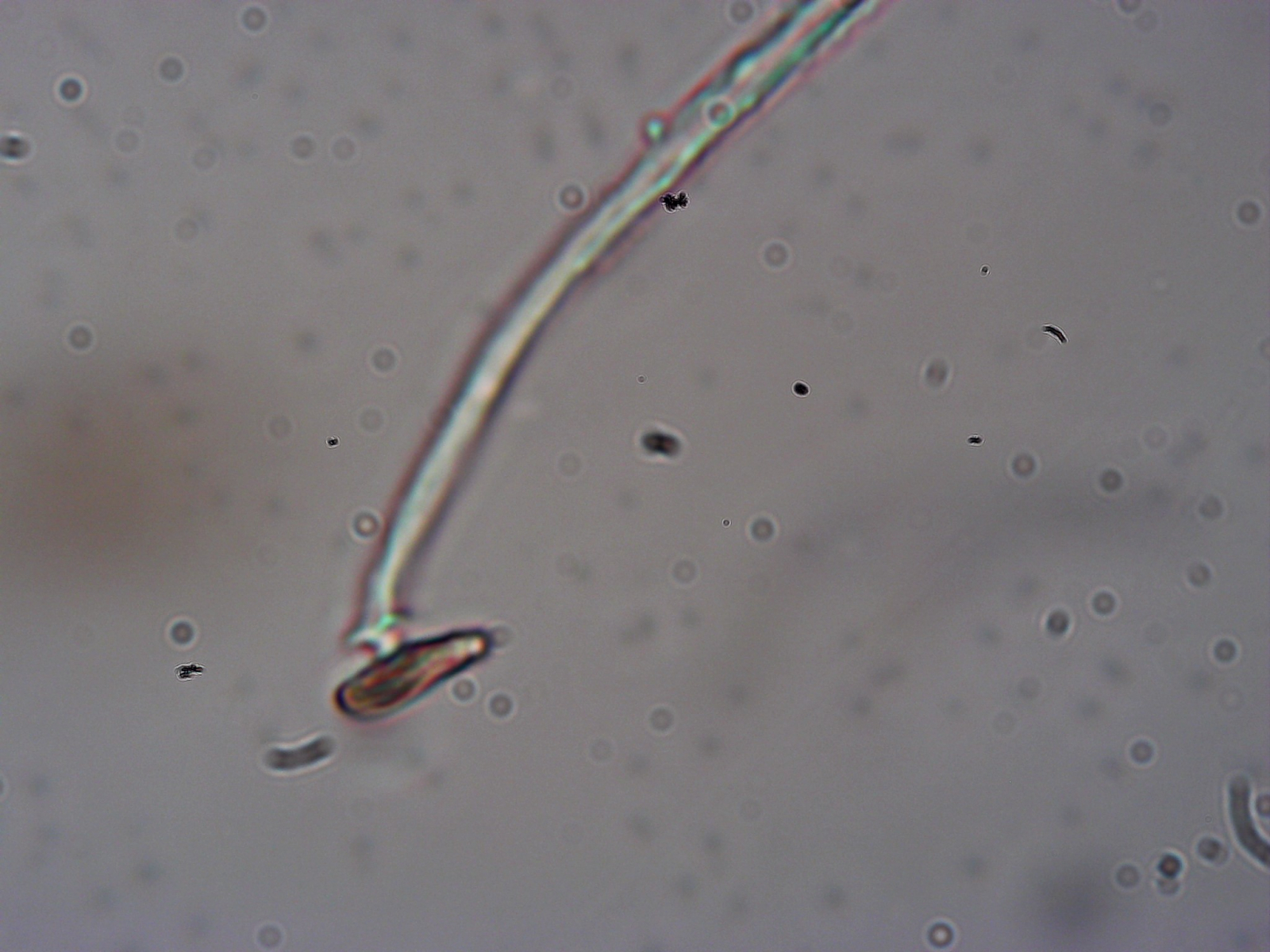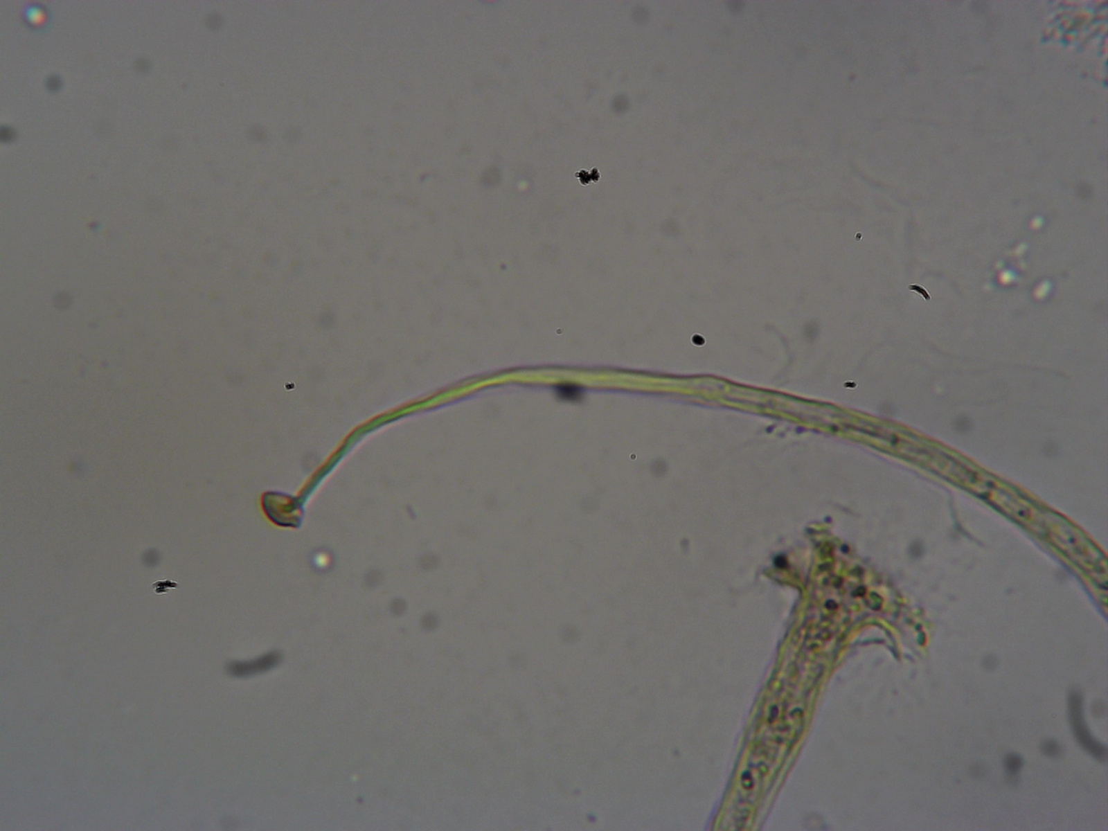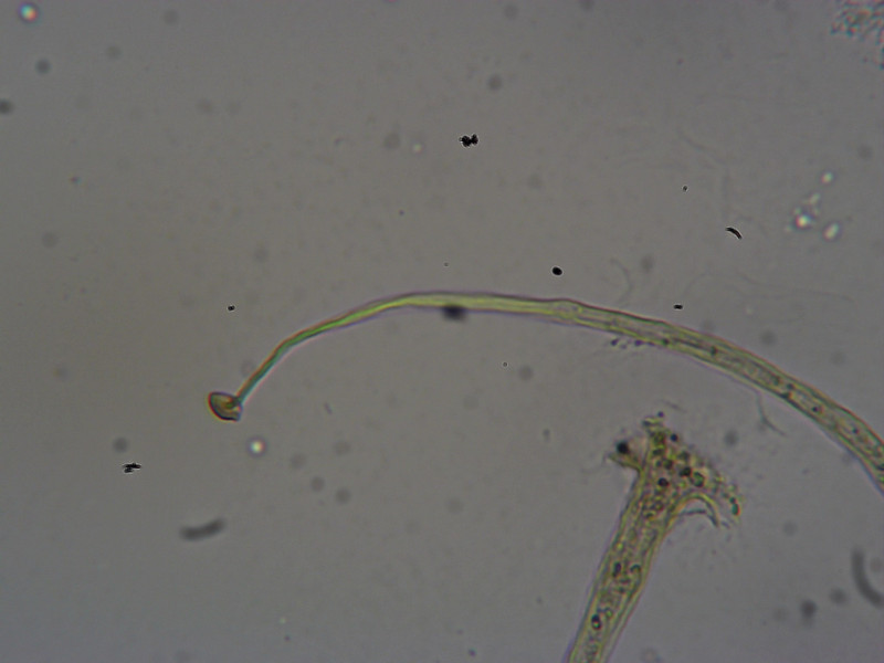 Die Fruchtkörperchen sind hier nur noch 0,15 mm hoch. Hätte ich nicht vorgestern E. minutum gefunden, dann hätte ich diese kleinen Burschen glatt nicht beachtet. Leider bin ich bezüglich meines technischen Equipments etwas eingeschränkt. Darum sind die Fotos besch... Das wichtigste Merkmal ist aber deutlich sichtbar: Die Columella ist linsenförmig und braun gefärbt. Es sind noch ein paar weitere Sporocarpien da, aber allein diese zwei unter die Linse zu bekommen war schon ein kleines Wunder. Sporen habe ich im Präparat eine (!) gefunden, welche auch noch zu klein und wohl von was anderem ist...