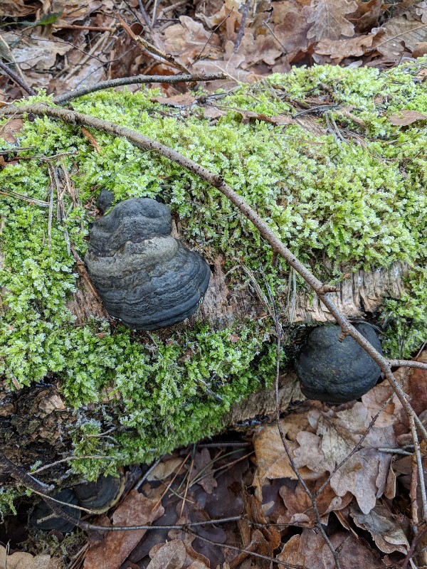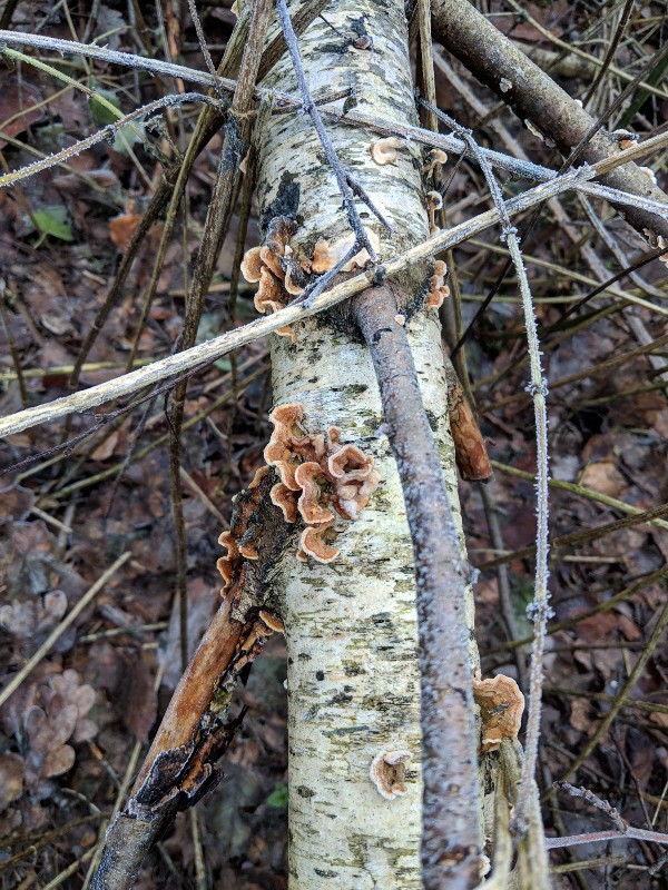 An einer anderen Stelle hatte noch etwas gefunden das eher wie der Birkenporling aussah, oben braun und unten weiss. Allerdings war auf der unteren Seite auch noch ein anderes weißes Zeug drauf, sah wie ein weiter Pilzbefall aus. Leider kein Foto davon...