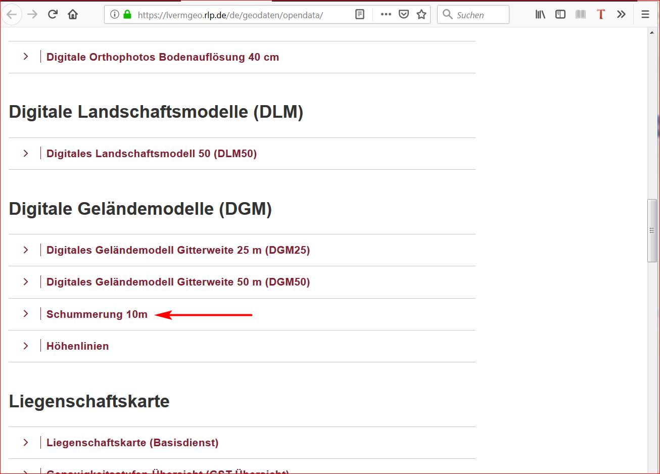 b) Dort nach unten scrollen bis zu den Digitalen Geländemodellen (nächstes Bild) und dort auf Schummerung 10 m clicken: