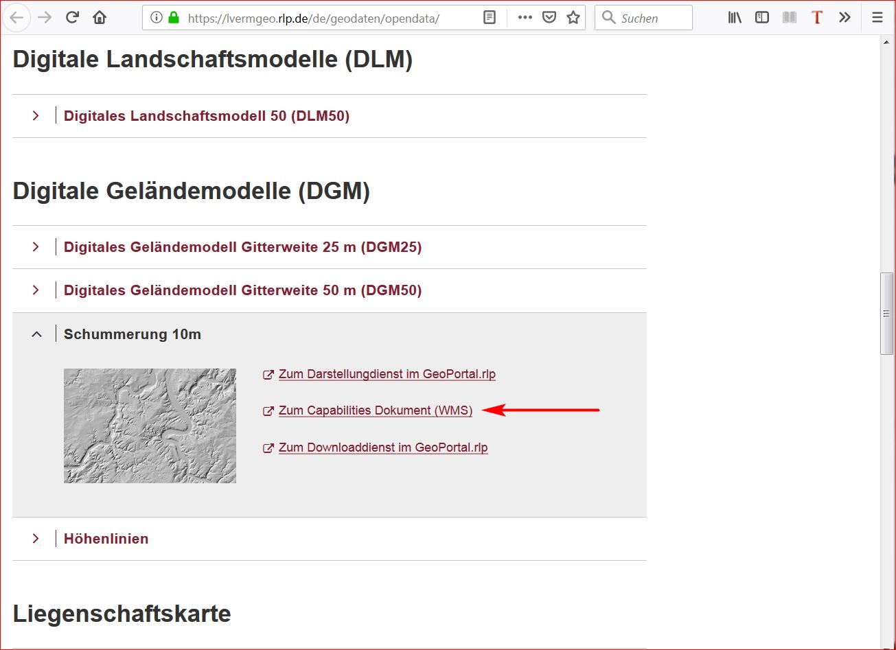 b) Hier findet man die WMS-URL des digitalen Geländemodells: