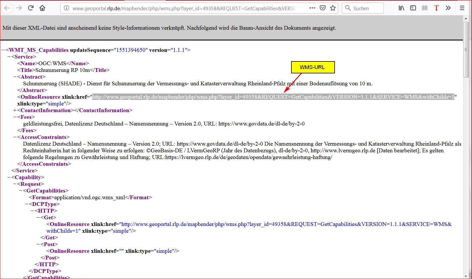 d) Es erscheint daraufhin der Text einer XML-Datei (nächstes Bild). Der rote Pfeil zeigt auf die WMS-URL. Wir kopieren die URL und geben sie in QGIS ein unter WMS/WMTS_Layer hinzufügen.