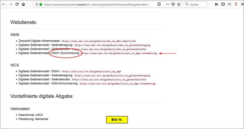 Unter dieser Internet-Adresse gelangt man zum DGM-Produktangebot von NRW. Weiter unten im Produktangebot (Bild 1b) sind die URLs aufgeführt. Wir kopieren den Link, auf den der Pfeil zeigt: