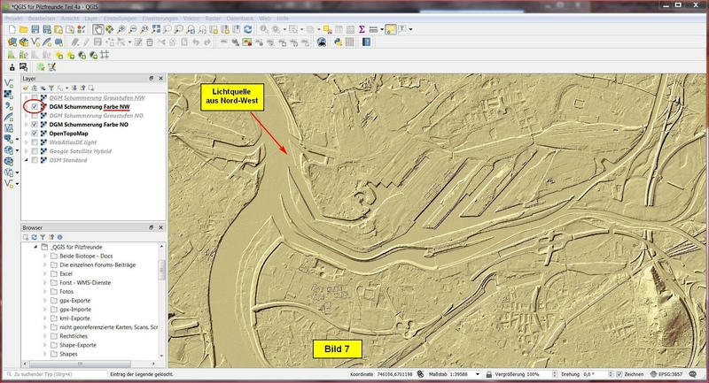 Für die folgenden Bilder wurde die DGM transparenzmäßig auf 70 Prozent Deckkraft eingestellt, so dass die darunterliegende OpenTopoMap schwach sichtbar wird.