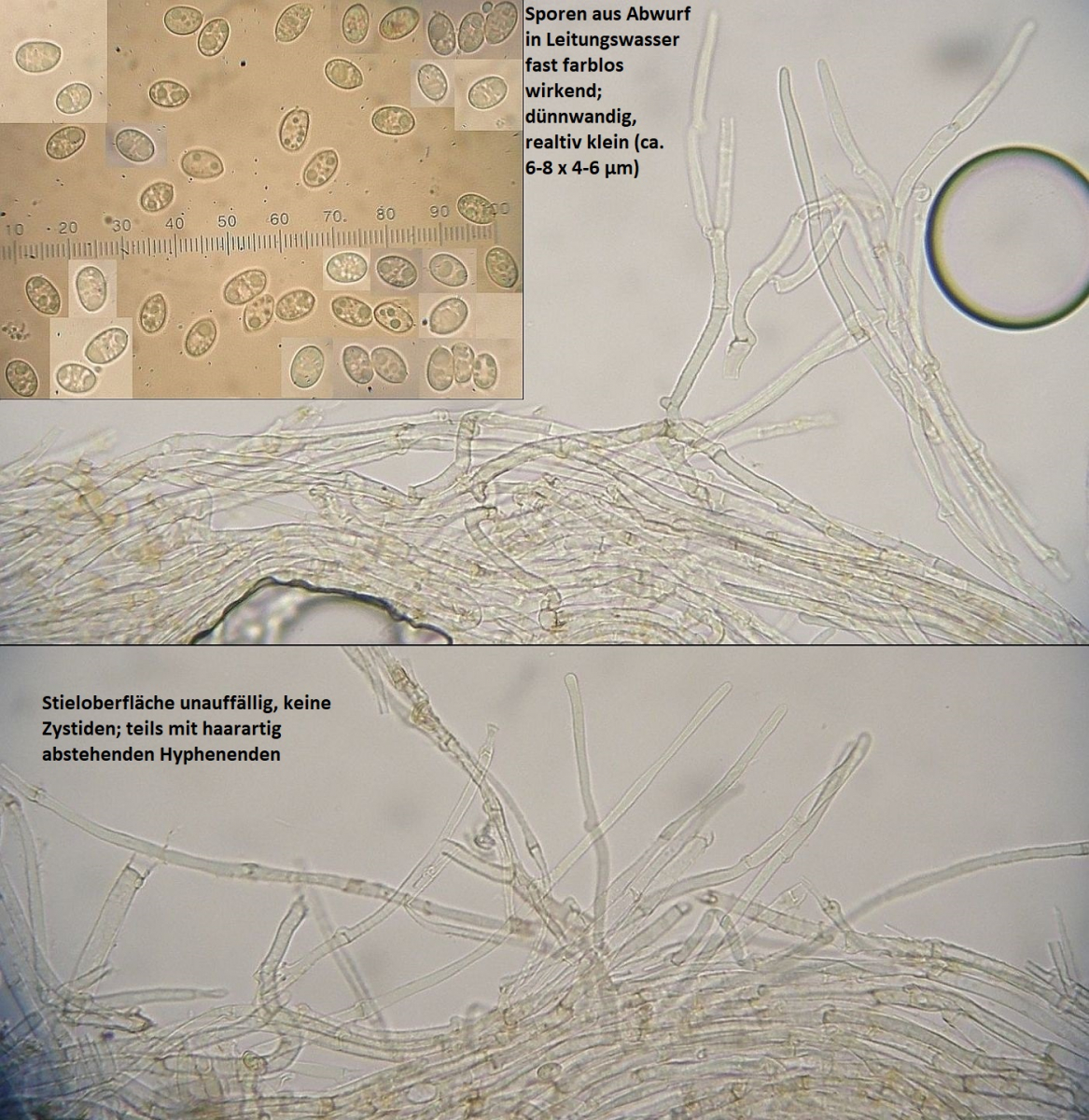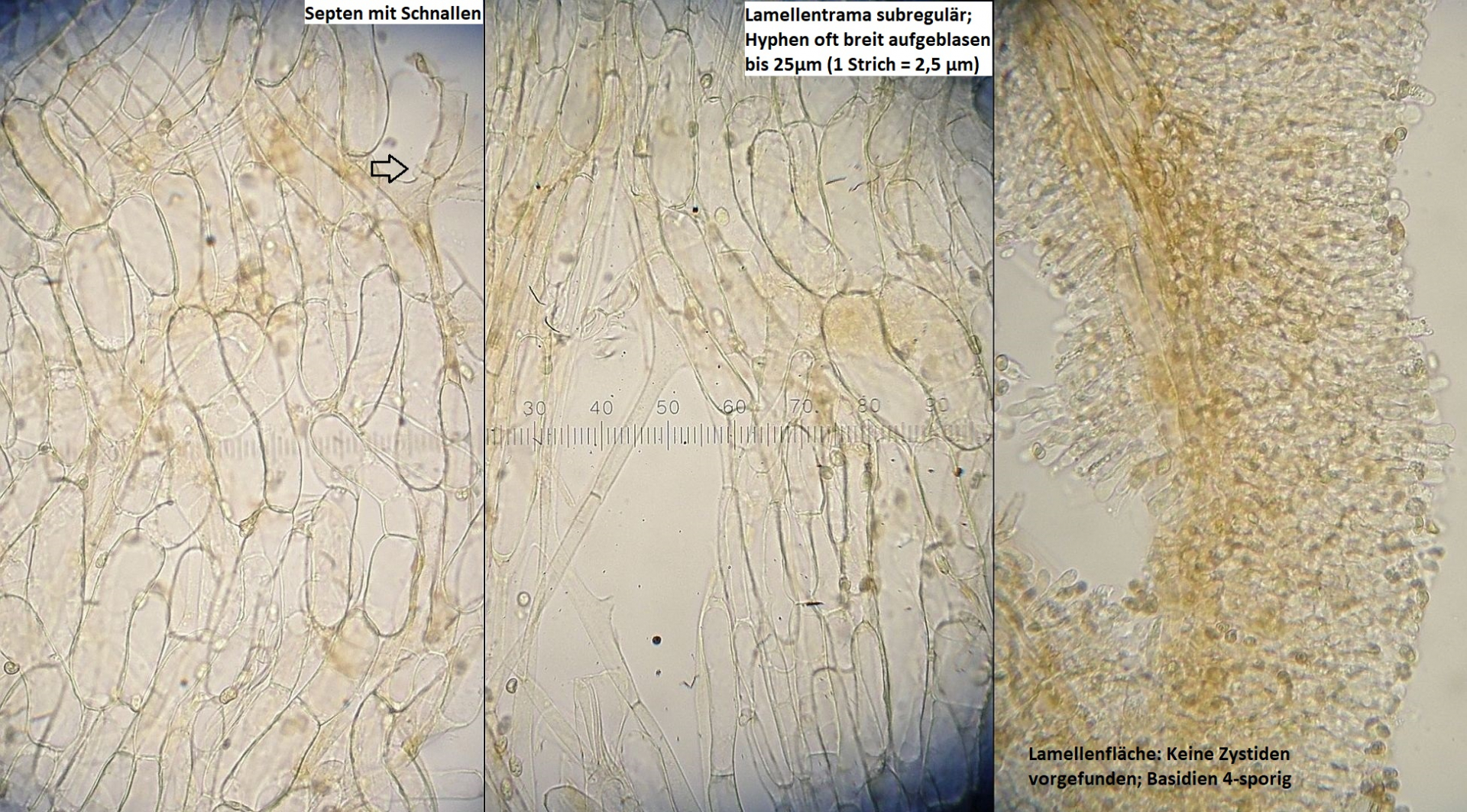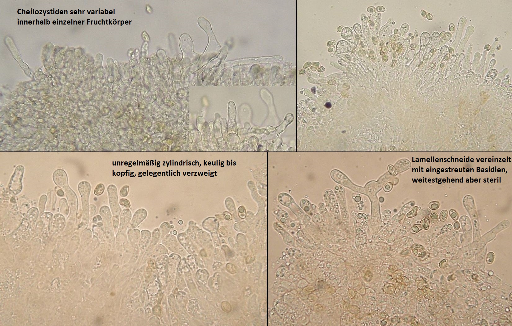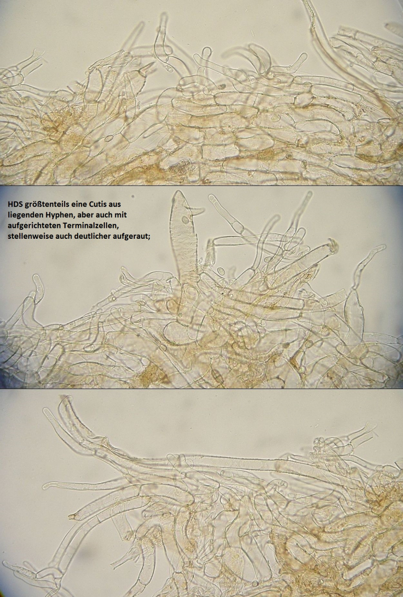 Mikroskopisch fallen vor allem die recht kleinen Sporen (max. bis ca. 8µm lang) und die superbreiten Lamellentrama - Hyphen (bis 25µm) auf, die Cheilozystiden sind innerhalb einzelner Fruchtkörper so variabel, daß sich daraus eigentlich garnichts ableiten lässt. Und das Zusammenspiel von eher kurzen Sporen und breiten lamellentramahyphen torpediert im grunde jeden Versuch, da was anderes draus zu backen als eine ganz normale TuFur.