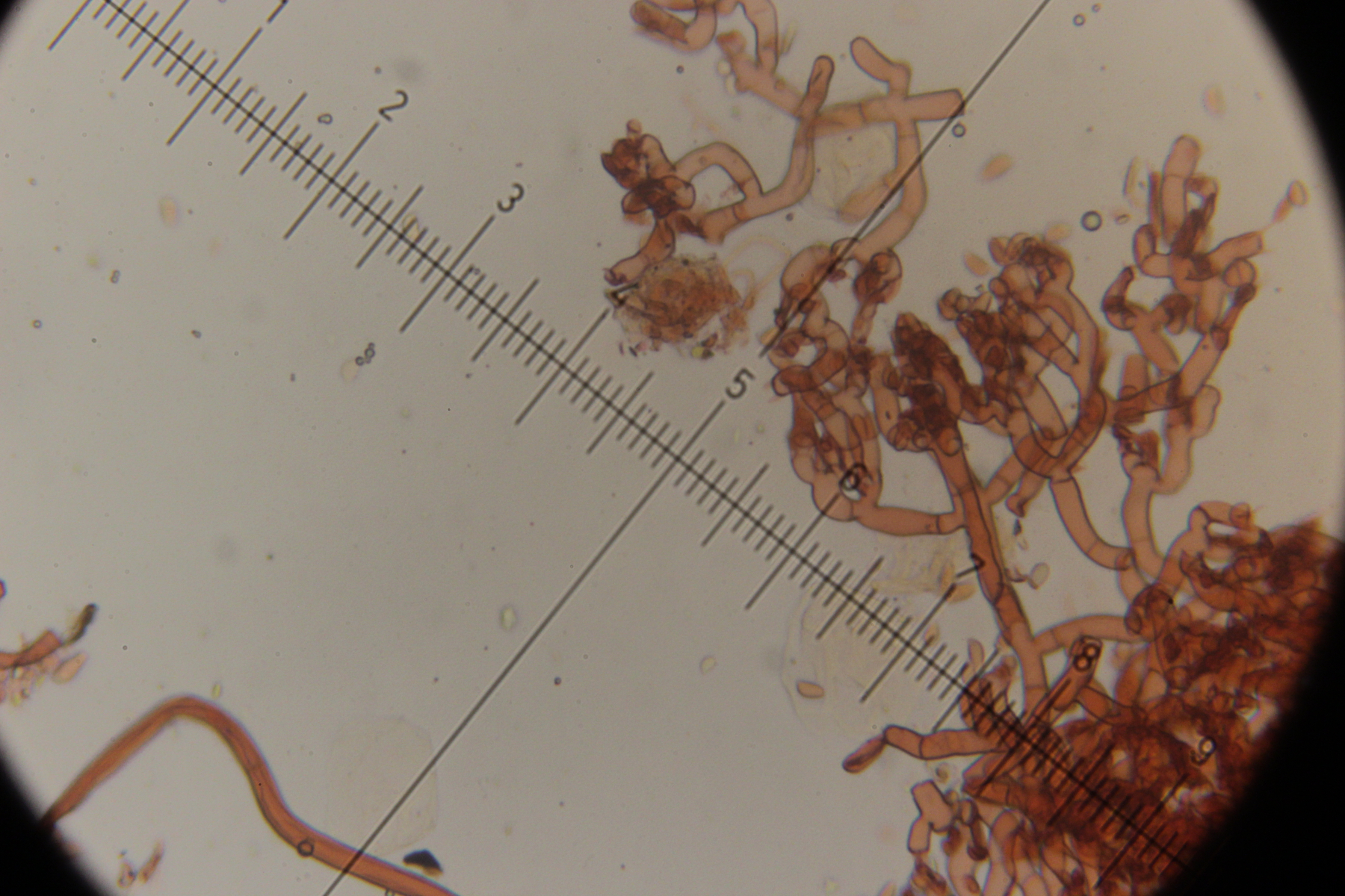 ja die Skeletthyphen haben sich aufgelöst. Da habe ich aber keine hübschen Fotos von machen können. Die eine Hyphe, die ich da fotographiert hatte, war halt einfach weg nach der KOH-Behandlung und das ganze Präparat war danach auch ohne Skeletthyphen eine ziemlich unfotogene Masse.