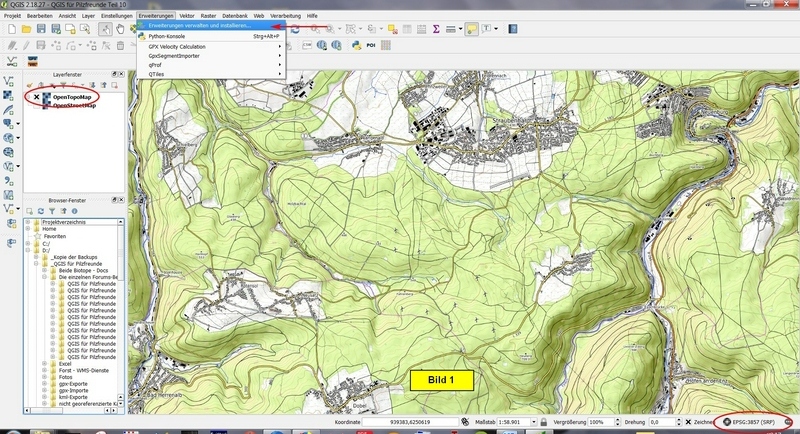 b) Dann integrieren wir noch diejenige Webkarte, die wir als Basis für die Offline-Basiskarte zugrunde legen wollen, z.B. OpenStreetMap, OpenTopoMap, Google Map... Wie man das macht, habe ich in Teil 2 und Teil 3 dieser Forumsreihe beschrieben. Ich arbeite hier mit der OpenTopoMap. und wähle als KBS WGS84 / Pseudo-Mercator EPSG:3857.