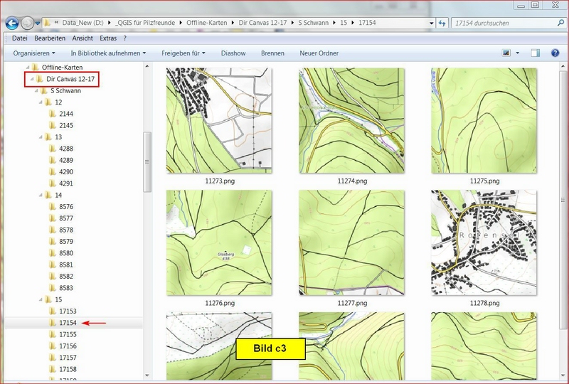Das hier benutzte Plugin QTiles übernimmt dabei automatisch diese ansonsten sehr aufwängige Generierung aller gewünschten Zoomstufen mit den zugehörigen Kartenkacheln. Zoomstufe 17 beispielsweise enthält für den hier bearbeiteten Kartenbereich 1802 Kacheln, verteilt auf 53 Ordner und beansprucht dabei etwa 55 Megabyte.
