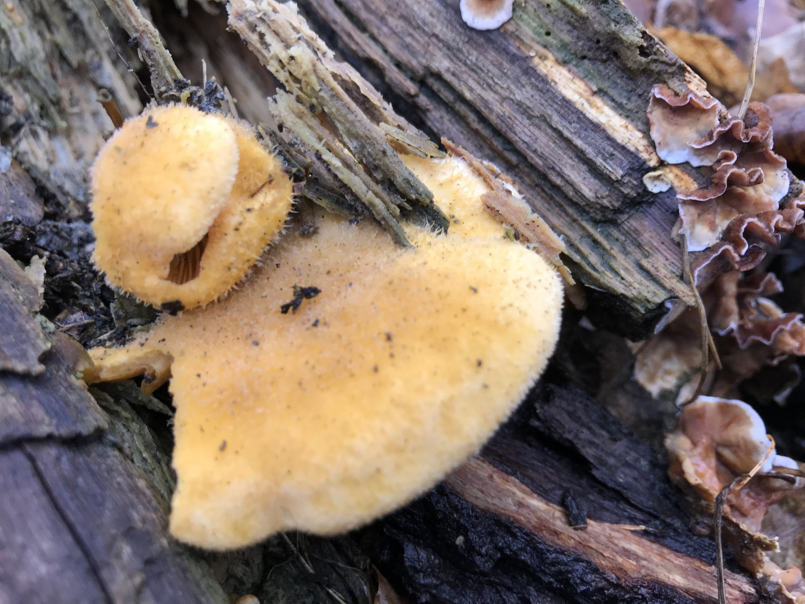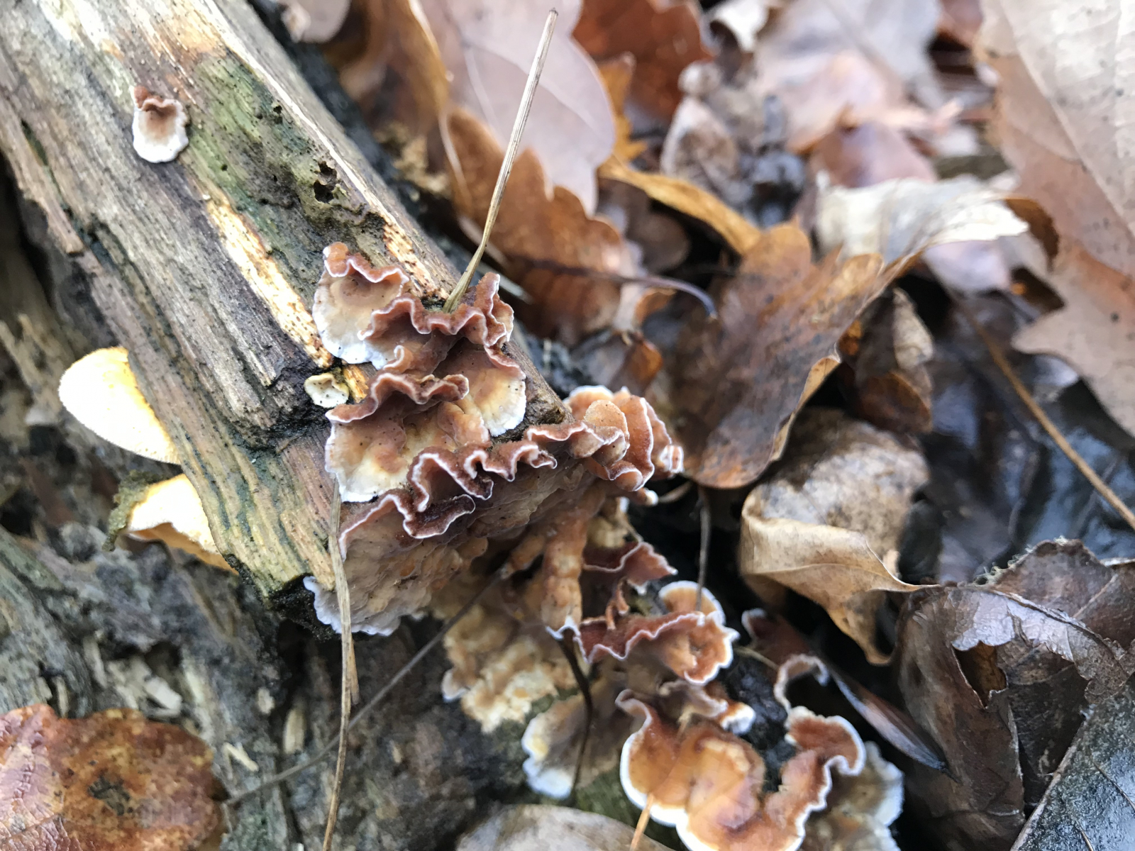 Ich habe mich heute am Schlossberg zu Wernigerode sehr über meinen Erstfund zum Orangeseitling gefreut. Beim Hinklettern zum Fotografieren fiel mir dann auf, dass am gleichen Stöckerl noch etwas Spannendes und Frisches wuchs. Ich würde es als einen resupinaten, Hütchen werfenden Schichtpilz bestimmen wollen.