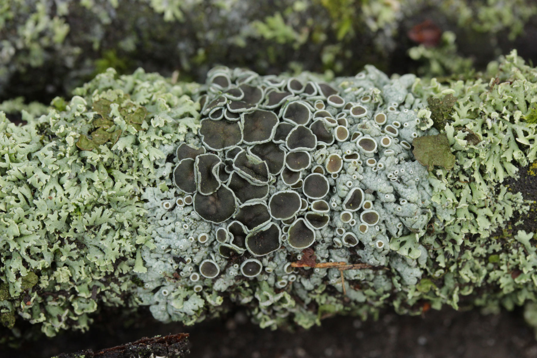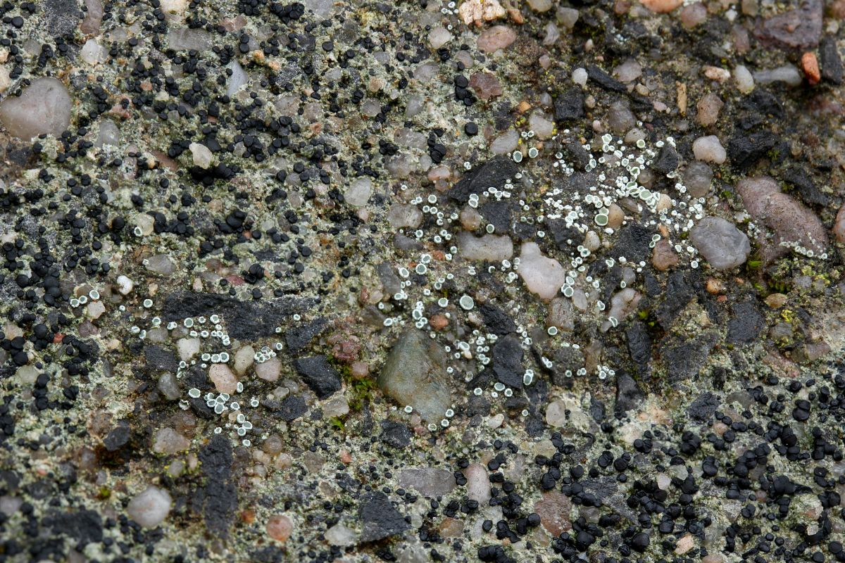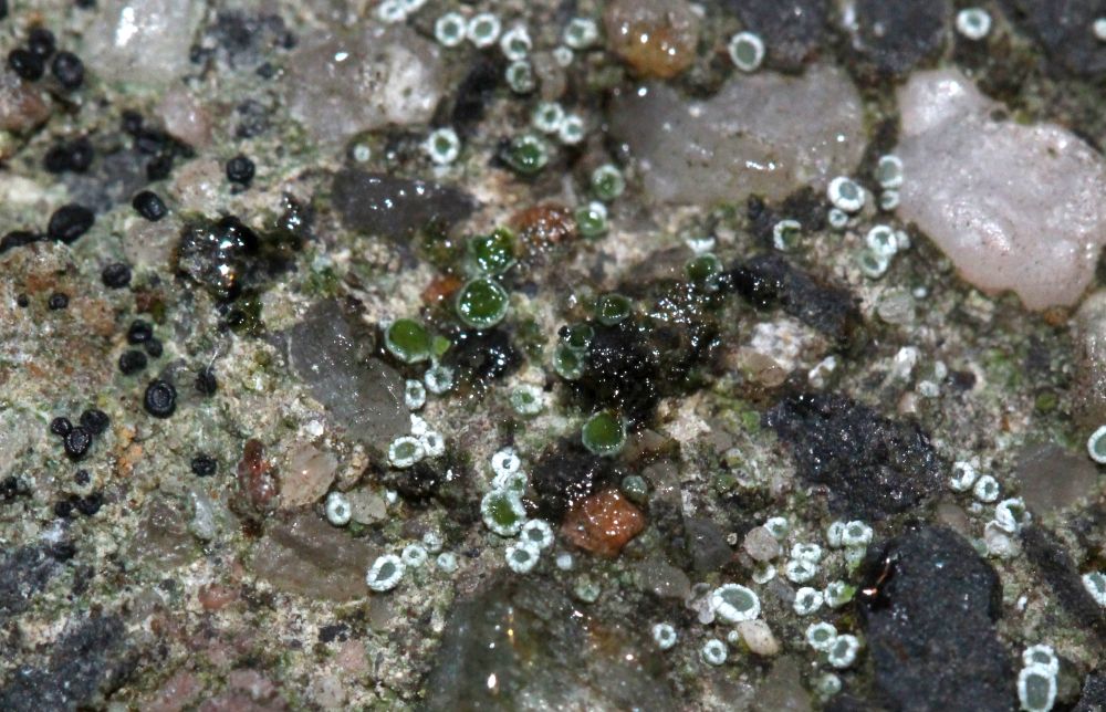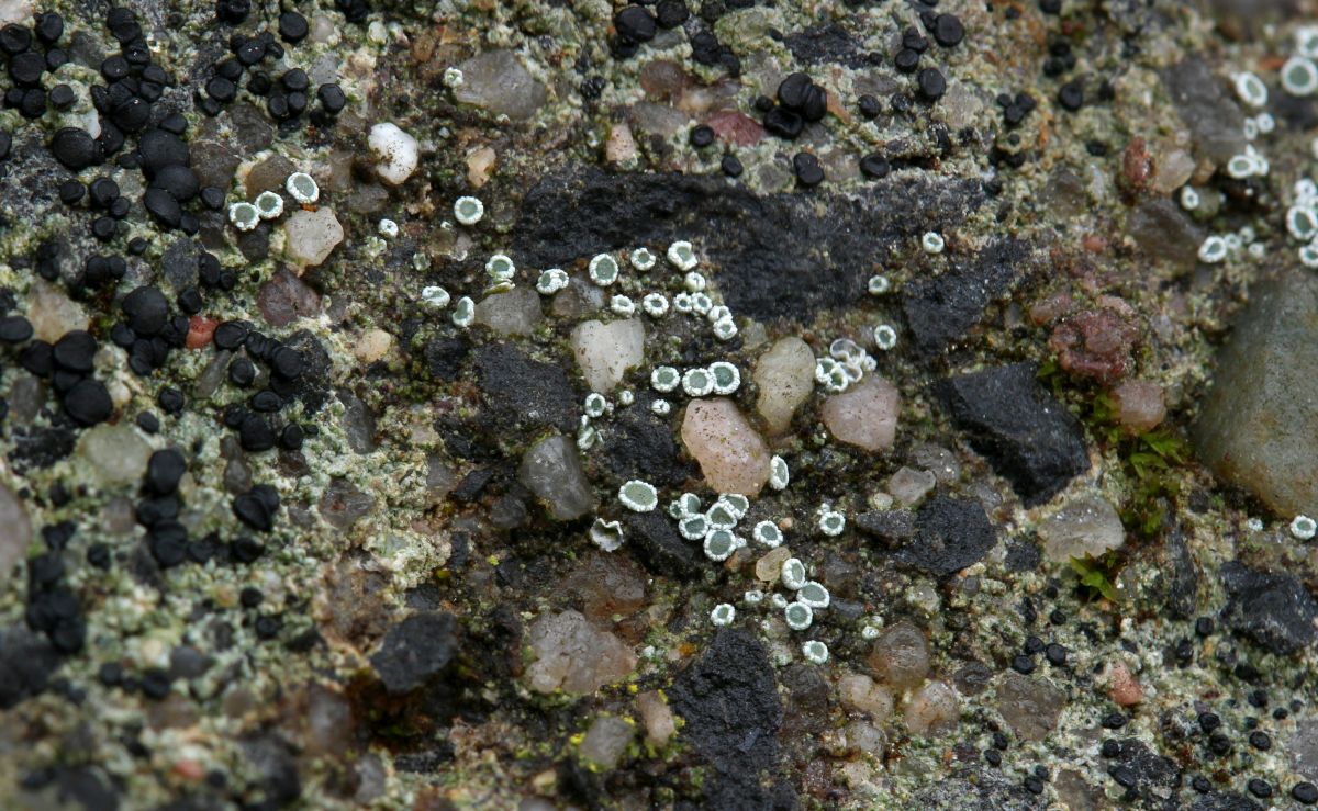 habe im Garten bei mir unmittelbar neben der kürzlich angefragten Lecidella stigmatea (also auch auf Beton-Zaunpfahl) noch weitere kleine Apothezien entdeckt. Ich könnte mir vorstellen, dass das Richtung Lecanora geht, aber noch hab ich keine Literatur darüber. Der Wirth ist bestellt, also im Laufe der nächsten Woche kann ich dann auch selber nachschlagen.