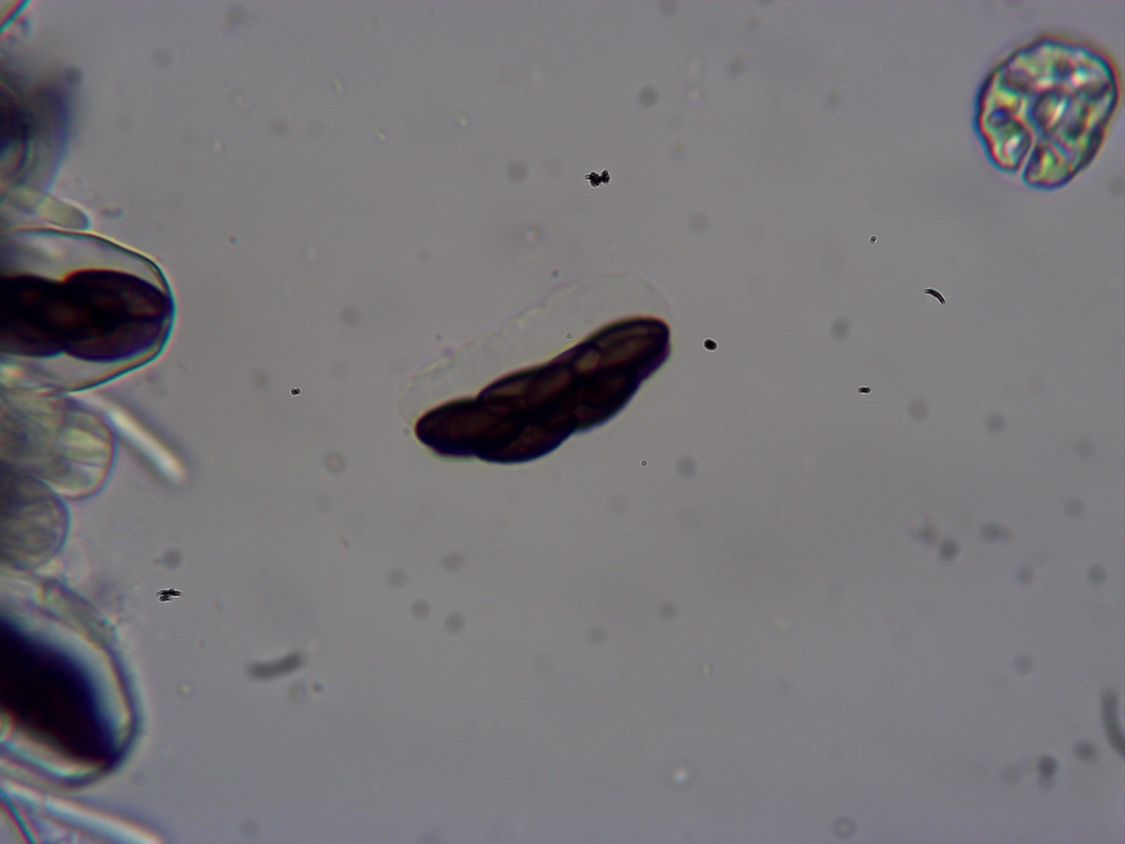 Sporenpaket mit 2er- und 3er-Reihen, auch abgeschossen im Cluster bleibend, Cluster ist dann nur auf einer Seite (!) mit einer dicken Schleimschicht bedeckt. Cluster 30-35 x 10-12 µm.