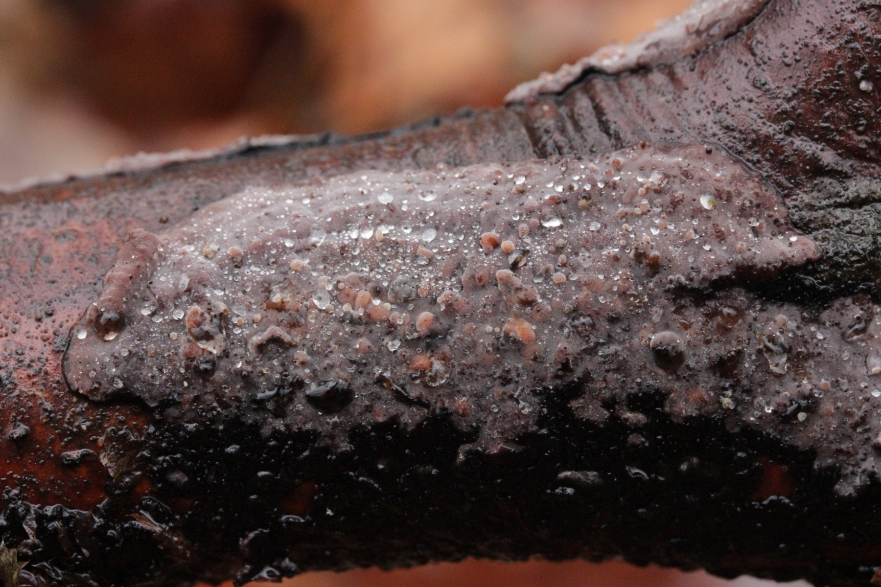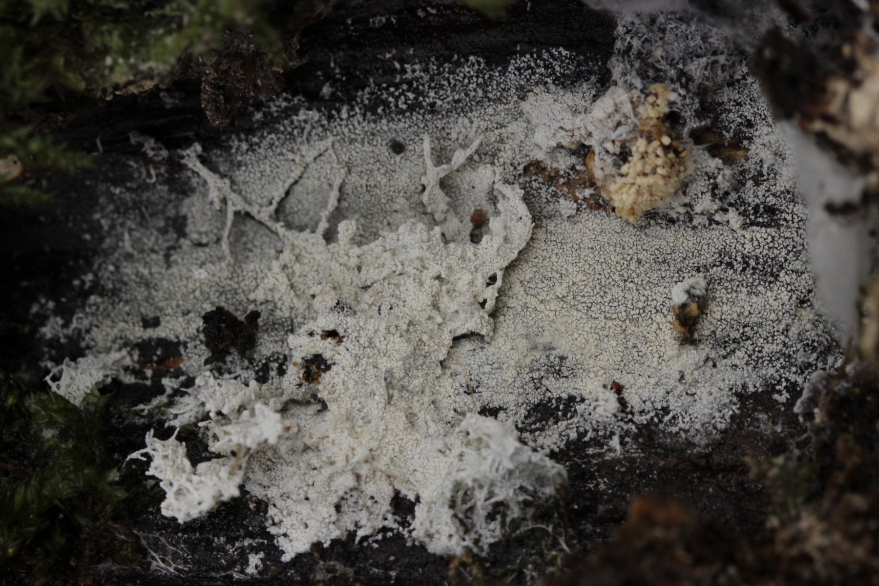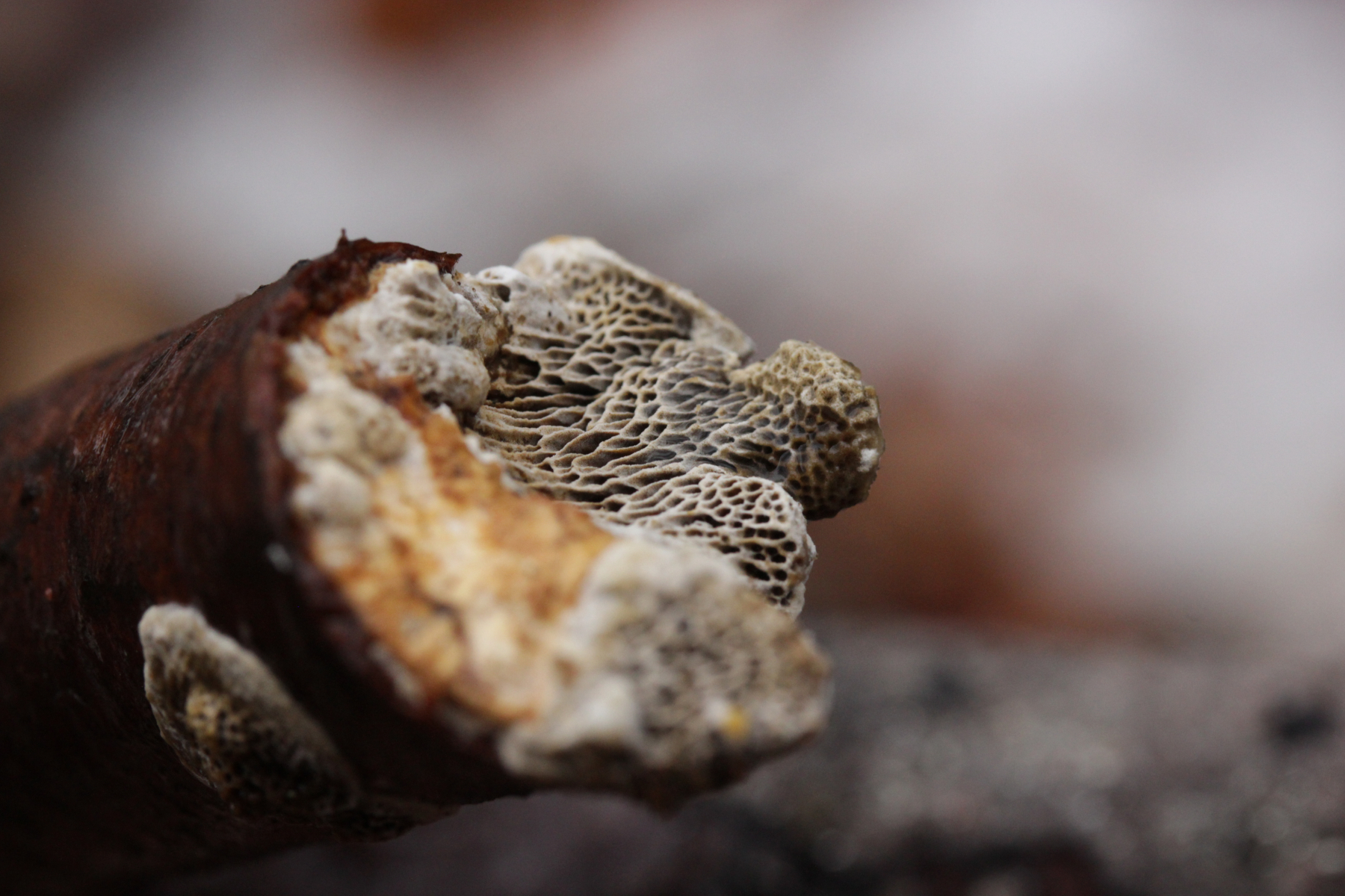 6. Auf der Unterseite eines dicken Stücks Eiche. Außer Hyphen gab es hier im Mikroskop leider nichts zu sehen. Ist das also einfach nur ein Mycel, was später mal ein richtiger Pilz werden will?