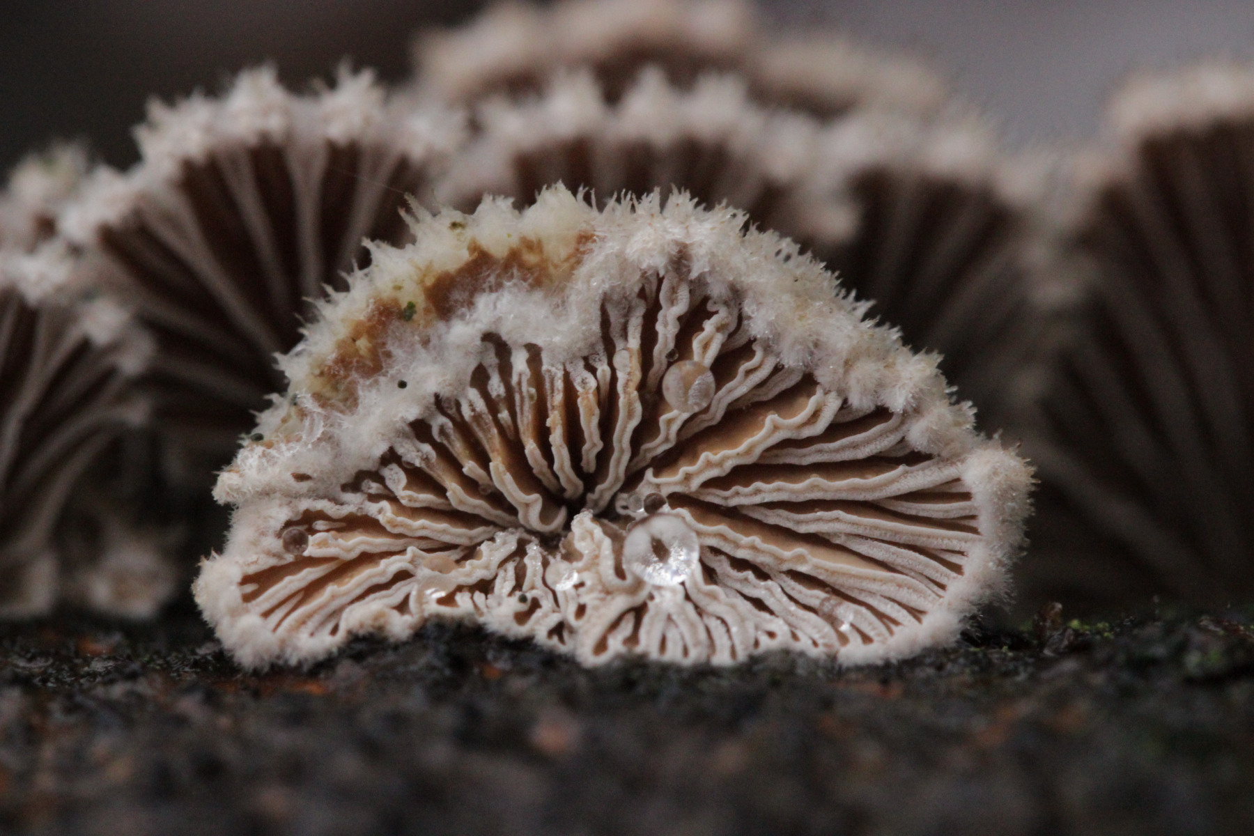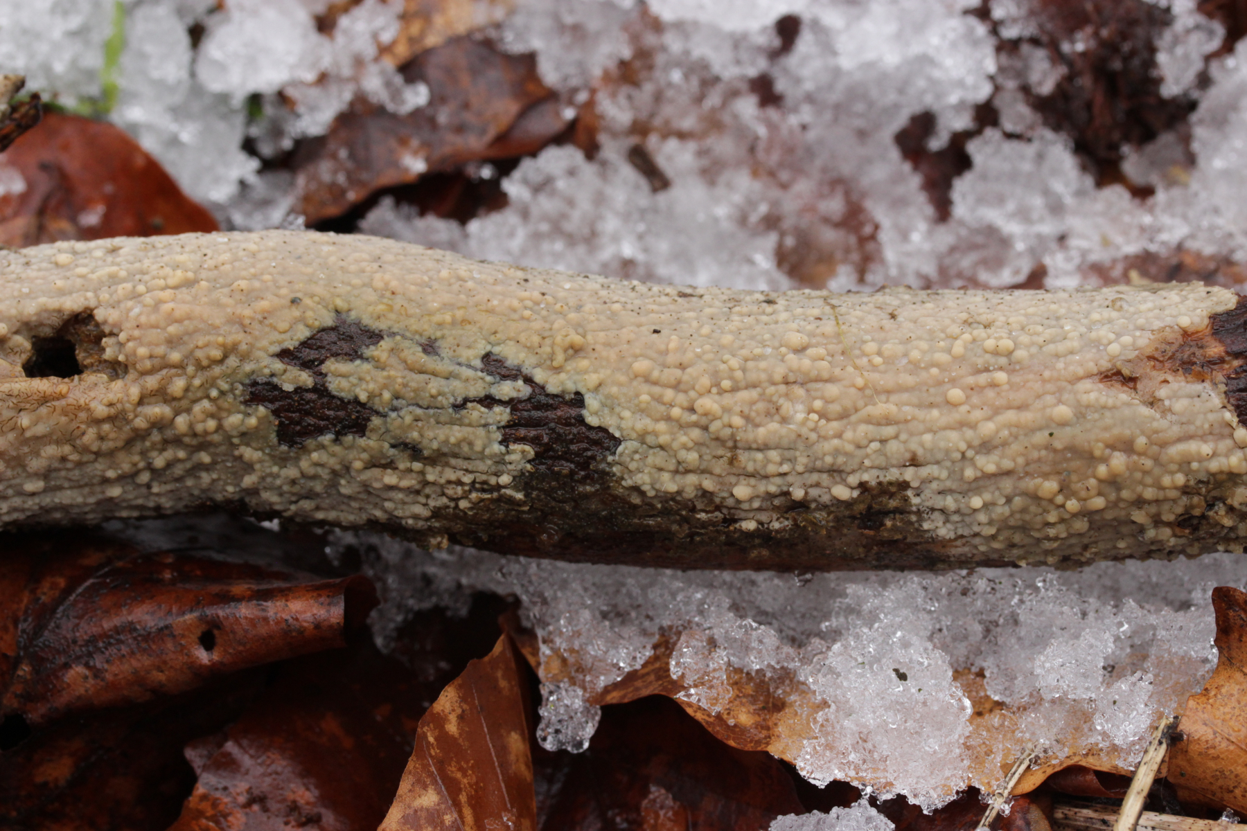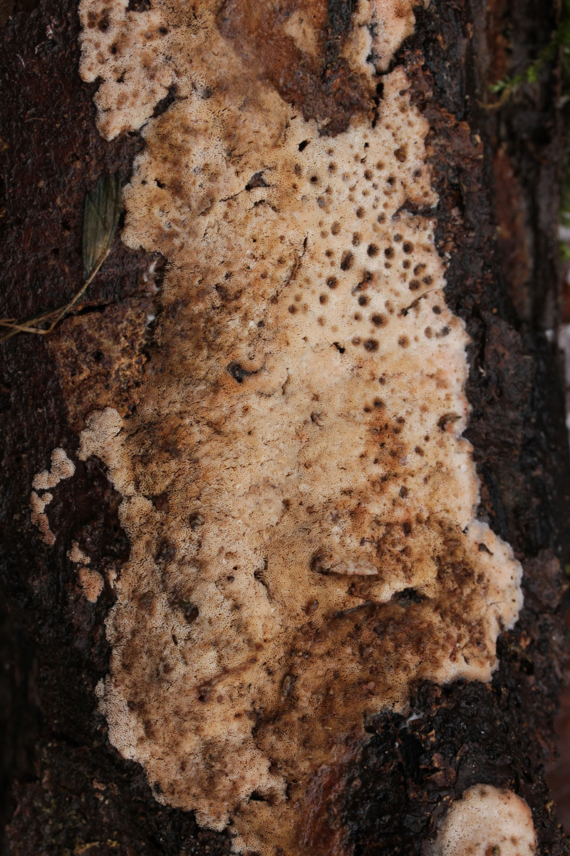 6. Auf der Unterseite eines dicken Stücks Eiche. Außer Hyphen gab es hier im Mikroskop leider nichts zu sehen. Ist das also einfach nur ein Mycel, was später mal ein richtiger Pilz werden will?
