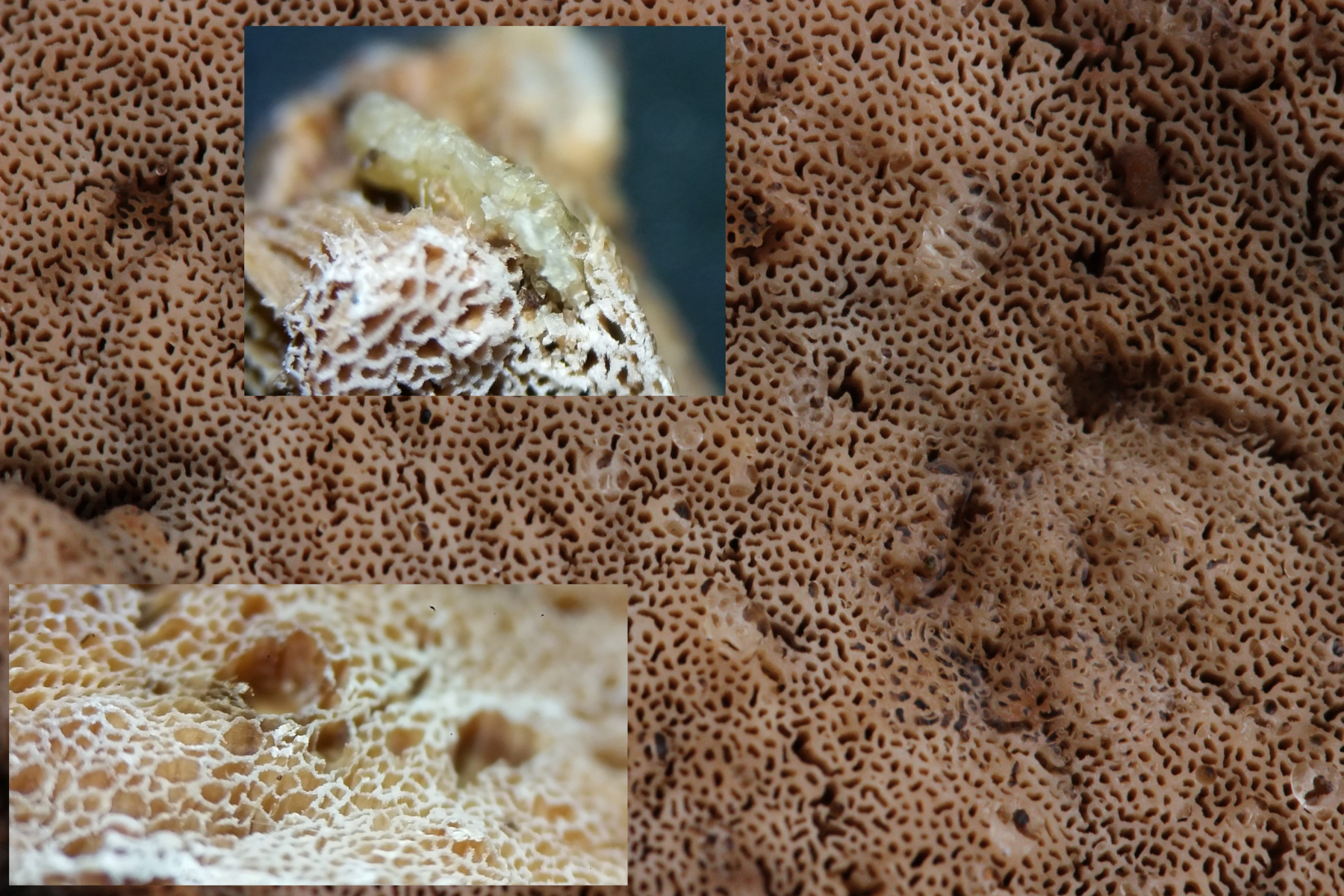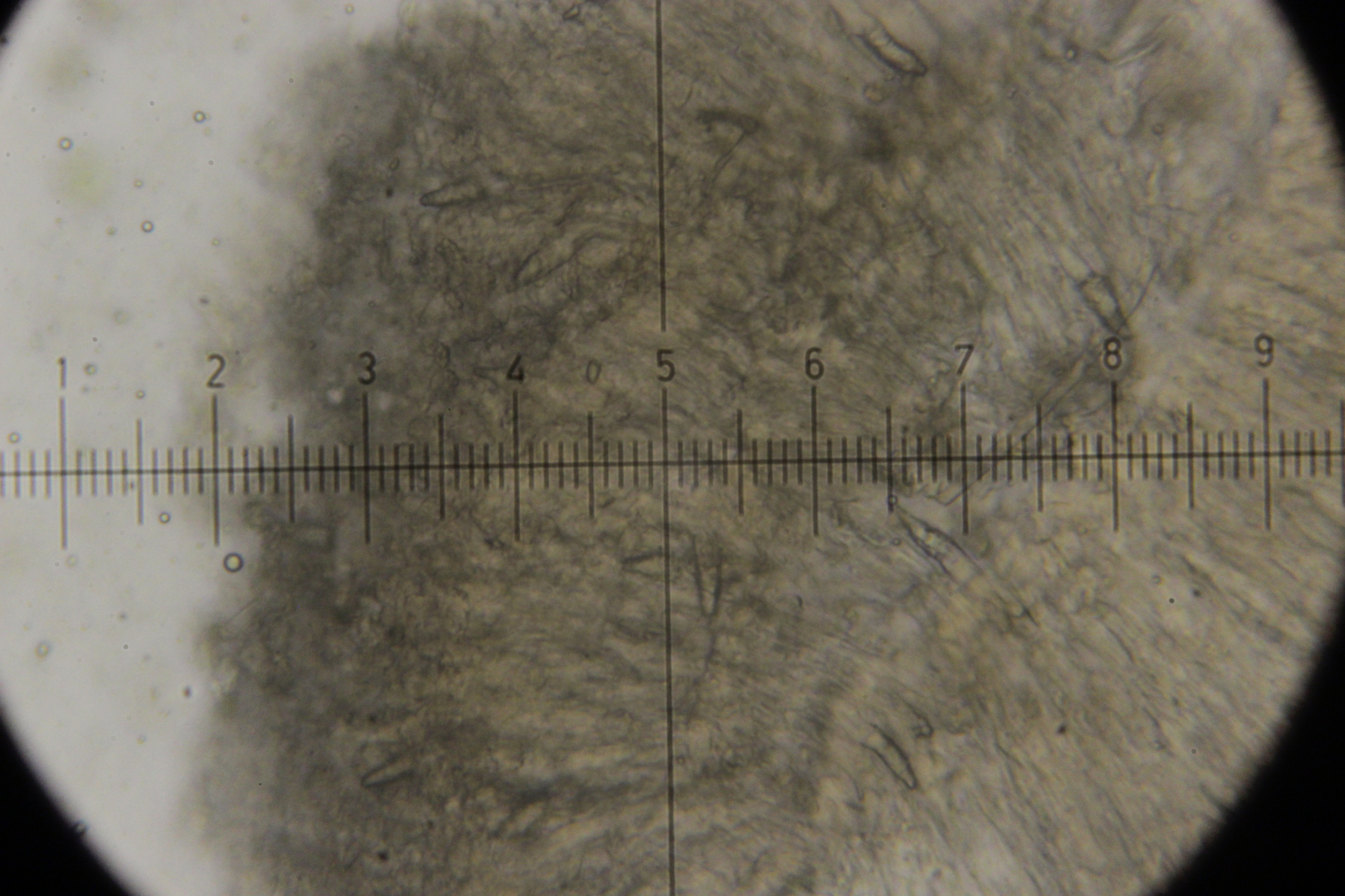 4. Ein Porling auf dem gleichen Ast wie Nr. 3. Irgendwie liegen mir Porling deutlich schlechter als Rindenpilze... die lassen sich irgendwie deutlich schlechter zubereiten. Entsprechend habe ich hier auch nur ein kleines, nicht weiter zerrupfbares Stücken unters Mikroskop bekommen, wo am Rande ein paar braune Hyphen rausragten.