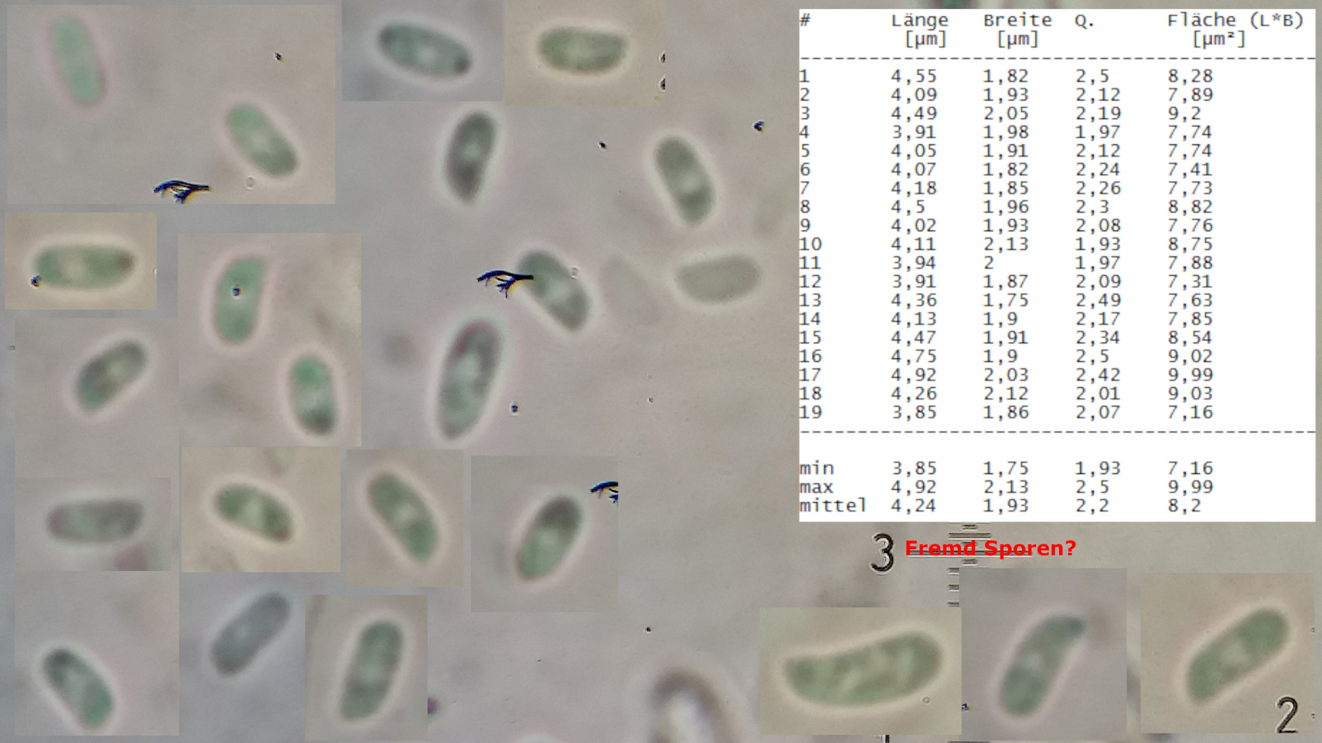 Mit Melzer. Im Mikroskop war der Blaustich der Sporen schon noch ein bißchen stärker ausgeprägt. Aber reicht das, um die Sporen amyloid zu nennen oder ist das nur ein Brechungseffekt?