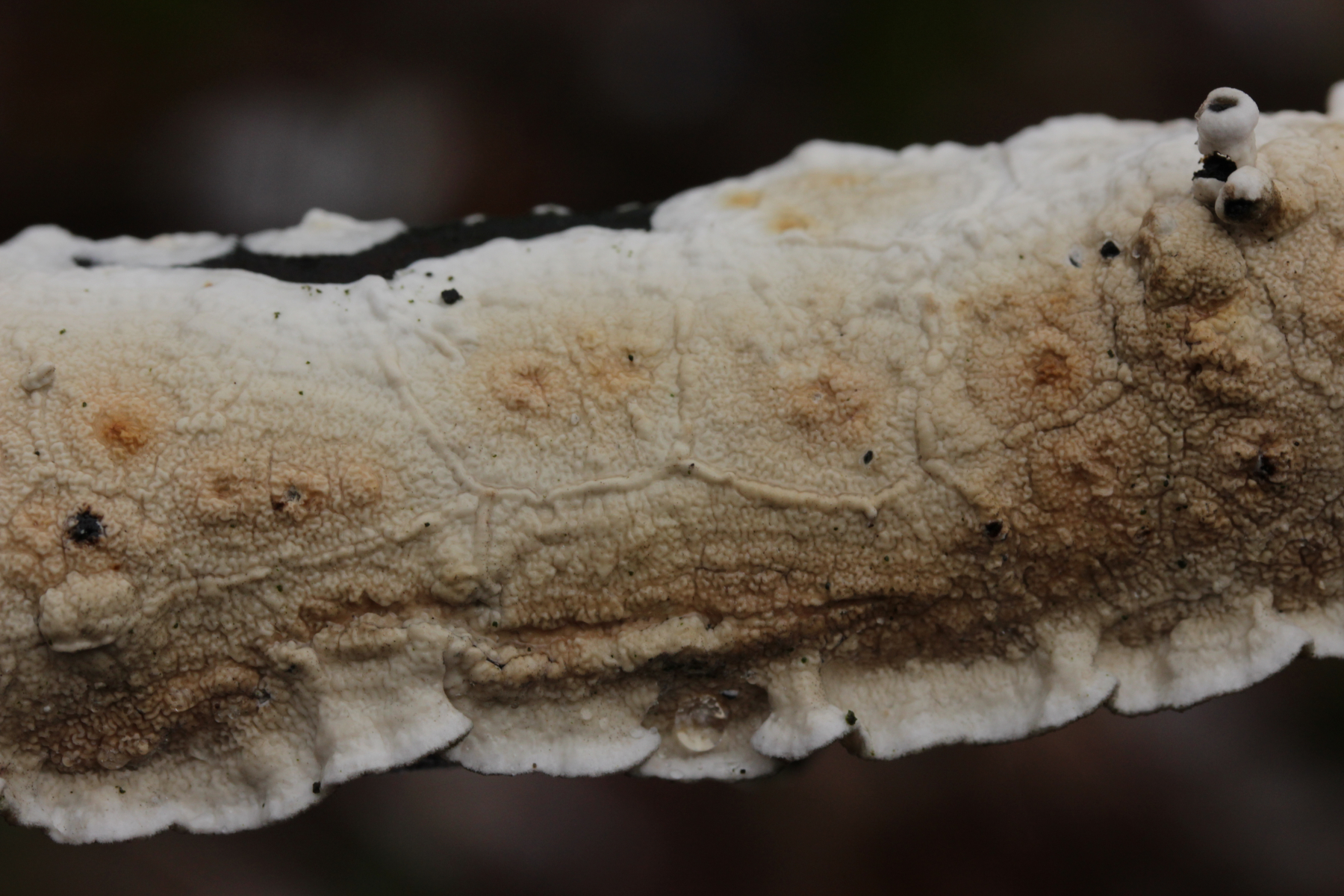 Die exudation Tropfen haben sich in eine gelbliche Masse ausgetrocknet und man kann auf die Poren Oberfläche einen weißlich/gelbliches Belag sehen sollten eigentlich typische Merkmale von einige (oder alle?) Ceriporiopsis Arten.