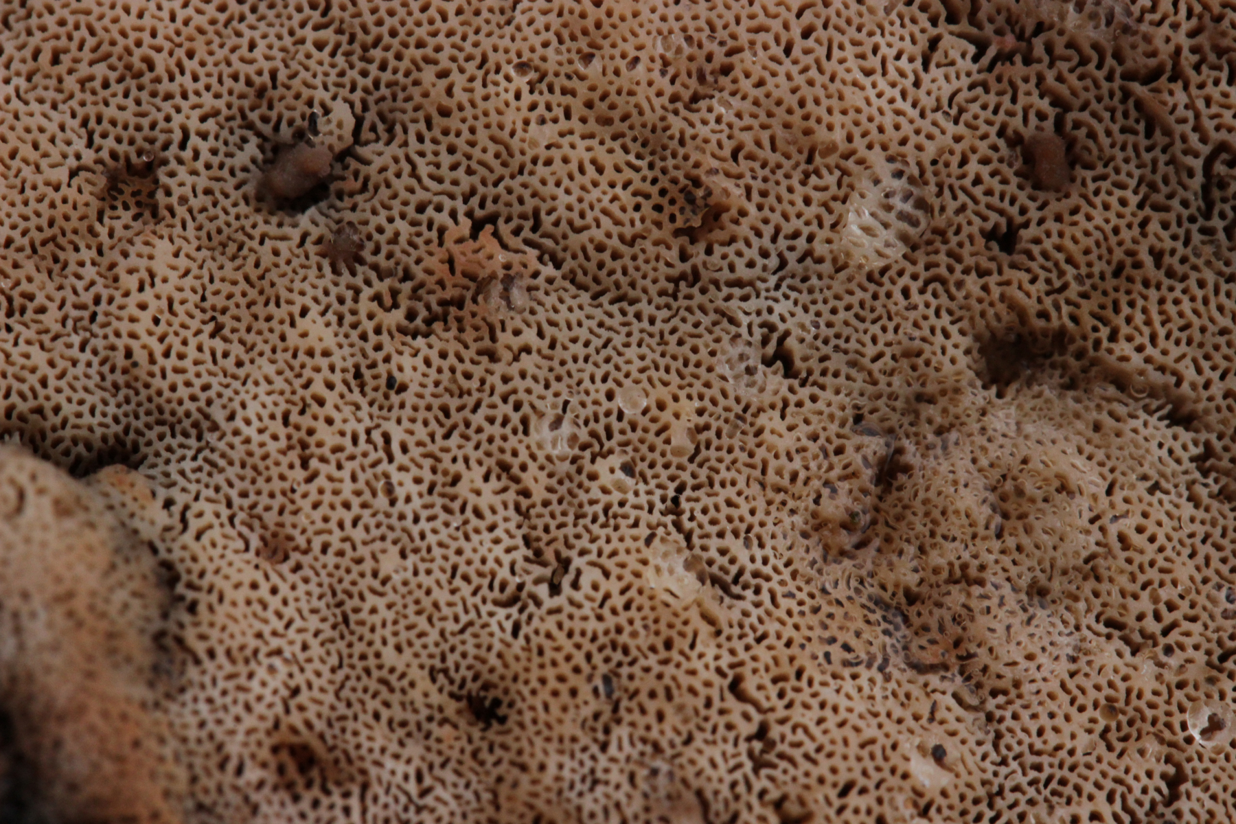 Die exudation Tropfen haben sich in eine gelbliche Masse ausgetrocknet und man kann auf die Poren Oberfläche einen weißlich/gelbliches Belag sehen sollten eigentlich typische Merkmale von einige (oder alle?) Ceriporiopsis Arten.
