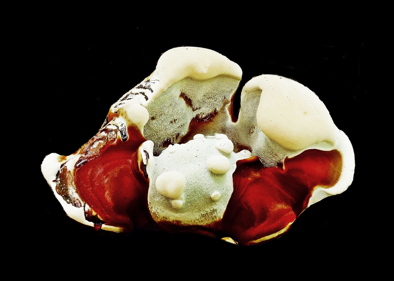Künstlerisch sind die schwarzen Hintergründe ein spannender Effekt (und hätten sich in einem passenden Mottowettbewerb übrigens weiter vorne eingeordnet, als im "normalen" Januarkontest). Um deine Bestimmung abzusichern, wäre aber der Hintergrund potentiell interessant gewesen: Die Wuchsweise ist im Grunde das Einzige, woran sich Ganoderma resinaceum und Ganoderma lucidum trennen lassen.