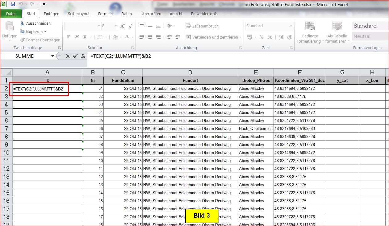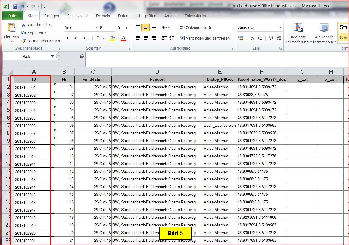 Die ID stellt eine für jeden Fund eindeutige Zahl dar, sie kann in Verbindung mit anderen Tabellen von Bedeutung sein. Hier wird als ID das Exkursionsdatum (JahrMonatTag) als Zahl genommen und die lfd. Fundnummer innerhalb der Exkursion angehängt. Beispiel: