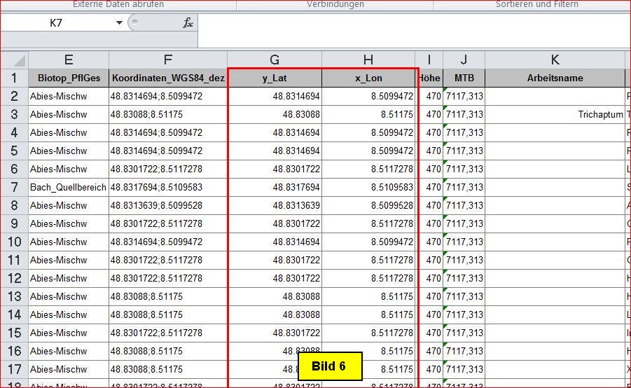 2) Ausfüllen der Spalten y_Lat, x_Lon (WGS 84 EPSG:4326 Dezimalpunkt)