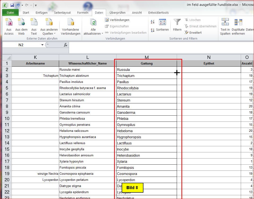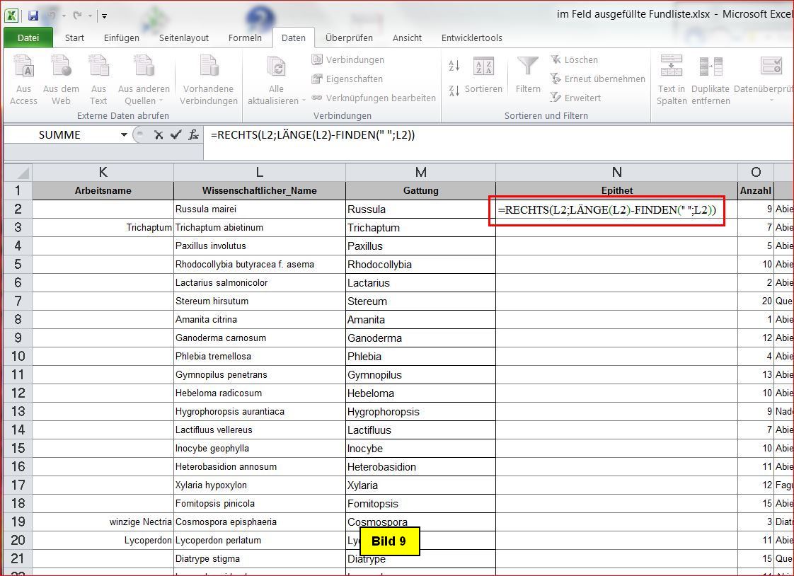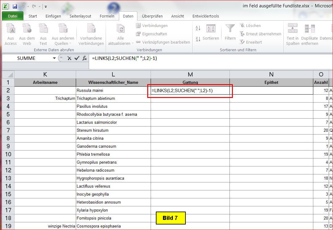 Die Aufspaltung des Pilznamens nehme ich deshalb vor, weil die beiden Namensteile bei späteren Auswertungen voraussichtlich in getrennter Form benötigt werden.