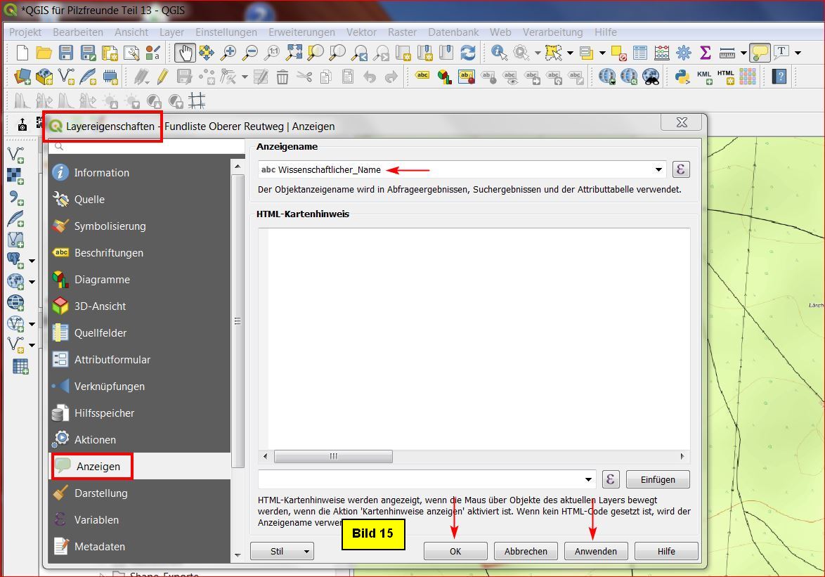 Wir doppelclicken auf diesen Layer, aktivieren im erscheinenden Eigenschaften-Menü links das Untermenü Anzeigen, selektieren unter Anzeiname in der Dropdown-Liste die Spalte Wissenschaftlicher_Name und clicken abschließend auf Anwenden und OK: