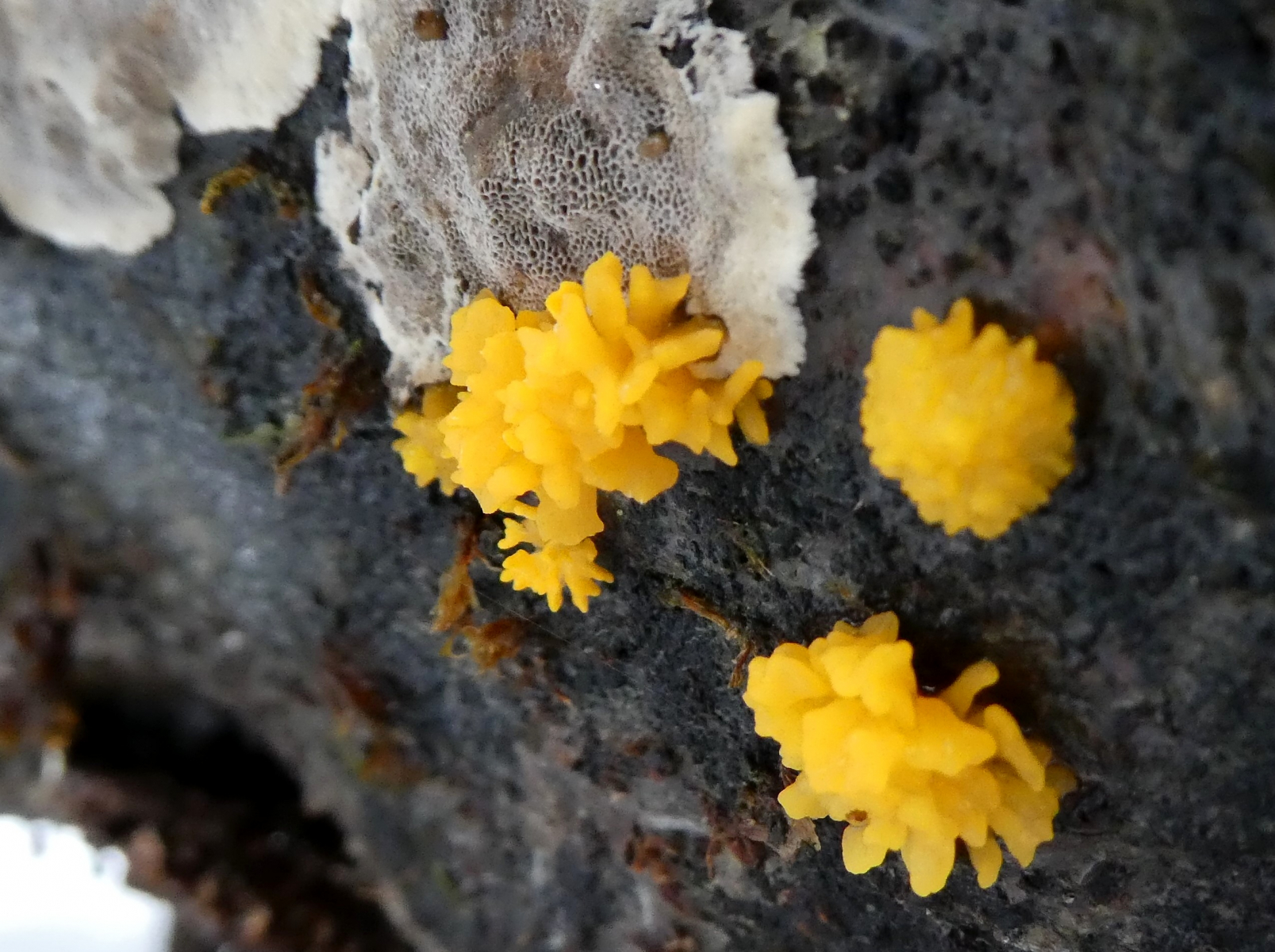 Was ist an Bild 1 grad neben Gelbe Fruchtkörper ? Erinnert an junge Tramete oder junge Stereum . Wenn junge Stereum hirsutum dann deine Gelbe kann Tremella aurantia sein (Parasitiert an S. hirsutum) . Schwer zu sagen um was genau gehet aber ich meine das C. Cornea ist nicht , aber ??? . Gibt jede menge ähnliche Kandidaten