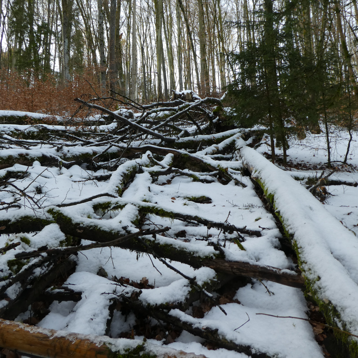 Die Pilze wachsen an einem am Boden liegenden Baumstamm, ich denke eine Rotbuche, in einem Mischwald. Am Stamm wachsen eine Vielzahl von Pilzen, darunter Austern-Seitlinge (glaube ich zumindest dass diese alten, tiefgefrorenen Pilze welche sind) und in etwa drei Meter Abstand auch eindeutige Laubholzhörnlinge.
