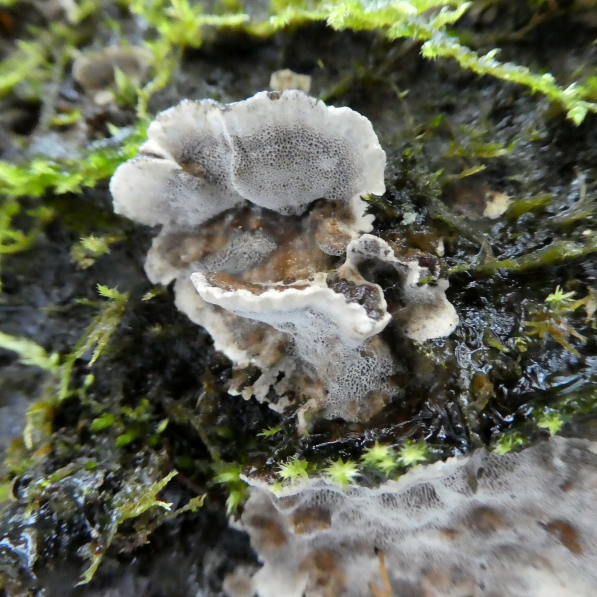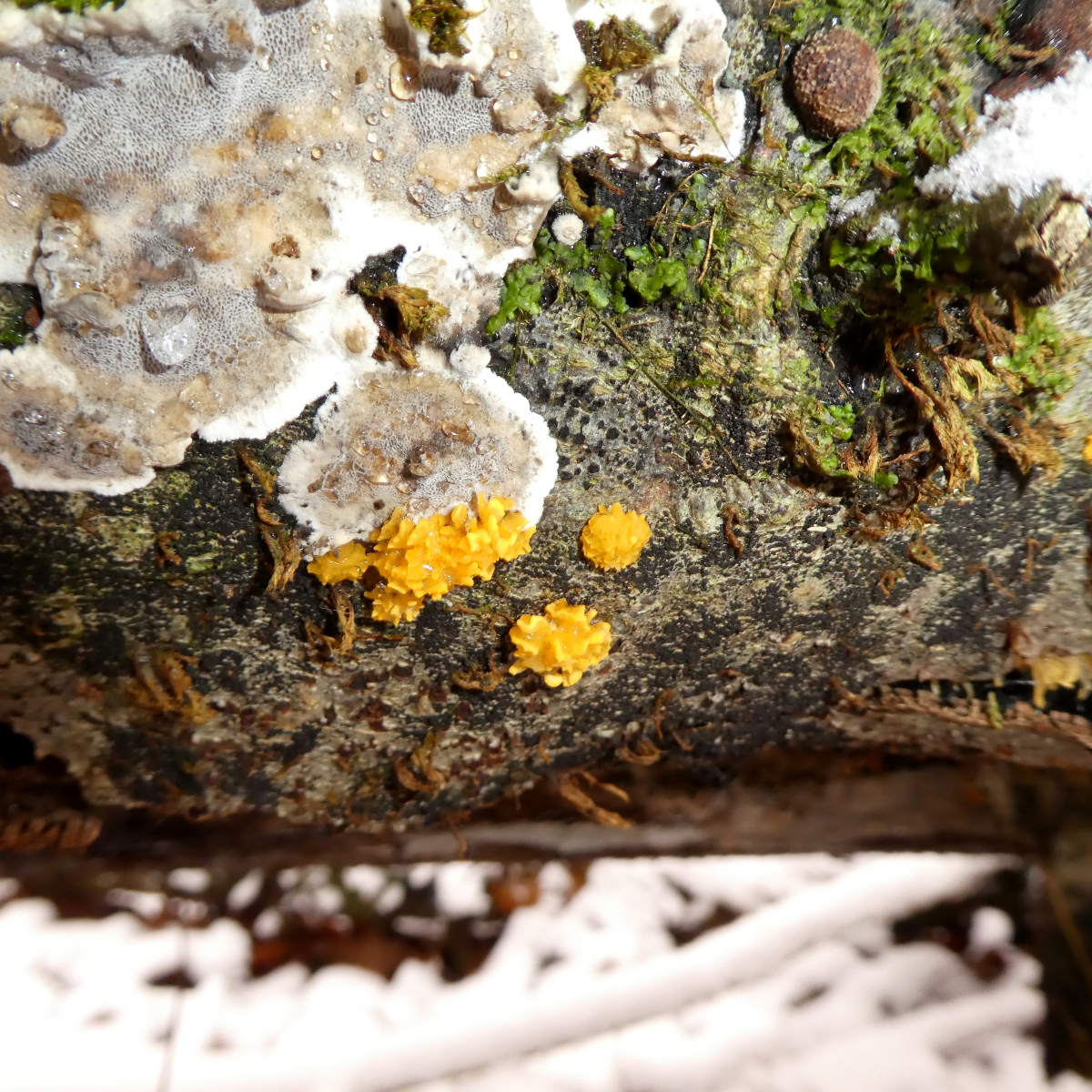 Was ist an Bild 1 grad neben Gelbe Fruchtkörper ? Erinnert an junge Tramete oder junge Stereum . Wenn junge Stereum hirsutum dann deine Gelbe kann Tremella aurantia sein (Parasitiert an S. hirsutum) . Schwer zu sagen um was genau gehet aber ich meine das C. Cornea ist nicht , aber ??? . Gibt jede menge ähnliche Kandidaten