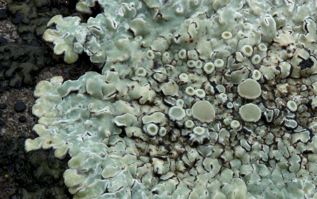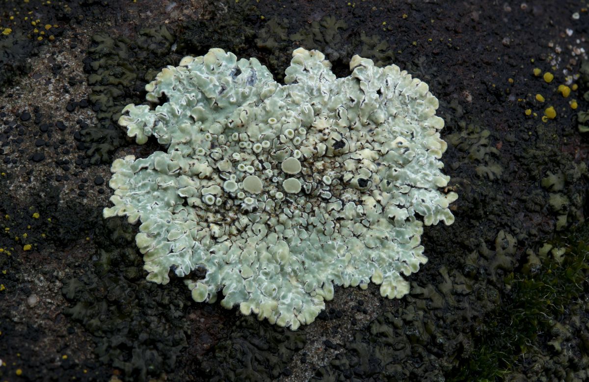 Auf einigen Bildern sind noch andere Flechten zu sehen, die habe ich als Rusavskia elegans (Bild 1, oranger Fleck), Candelariella aurella (Bild 2, gelbe Pünktchen oben rechts und links) und Lecidella stigmatea (Bild 2, schwarze Pünktchen oben links) bestimmt. Das blattartige Gebilde in Bild 2 neben der Lecanora hab ich nicht angeschaut. Auf alle Fälle viel los an solchen Mauern. ![]()
