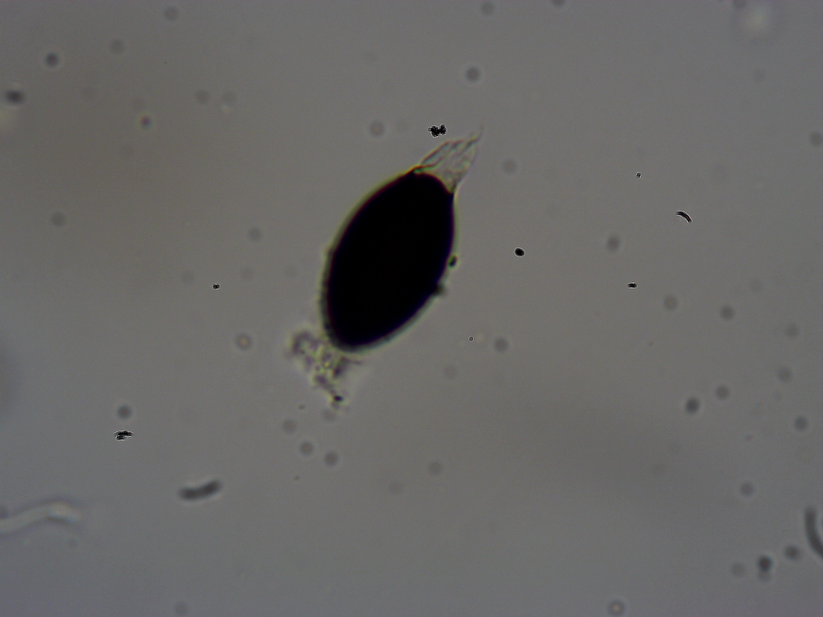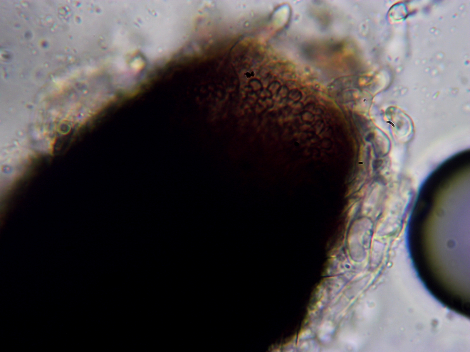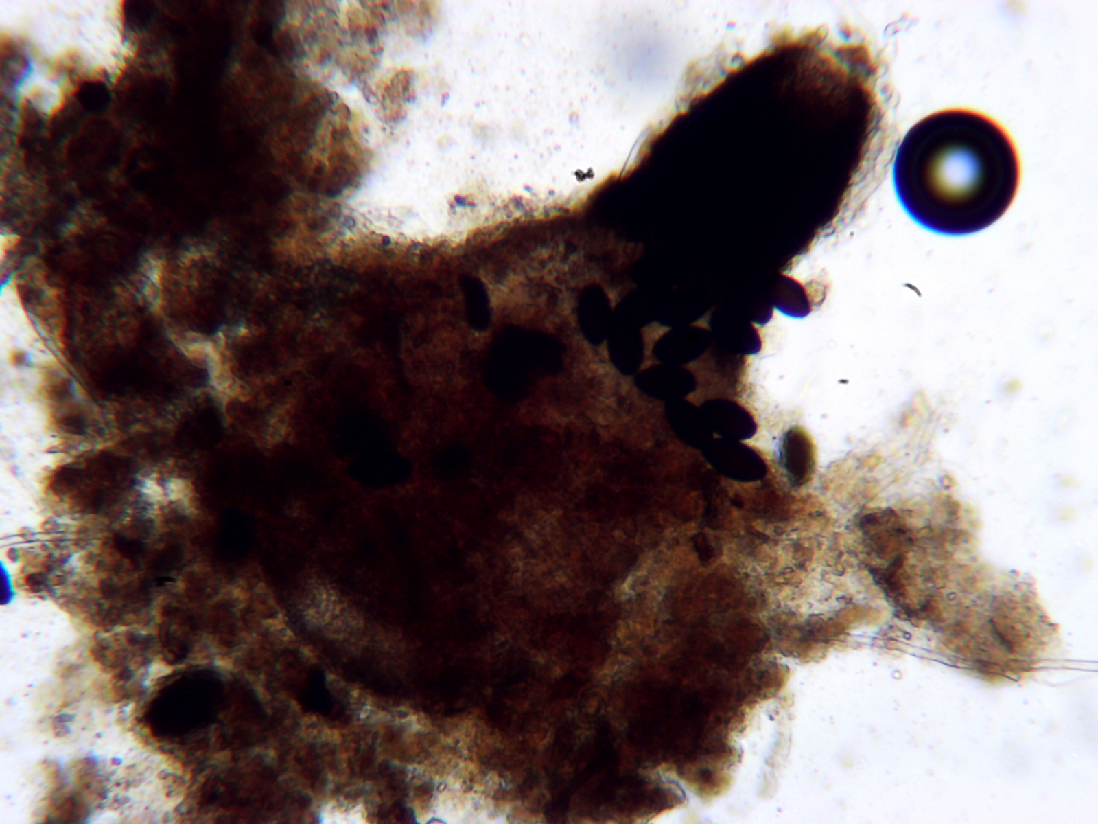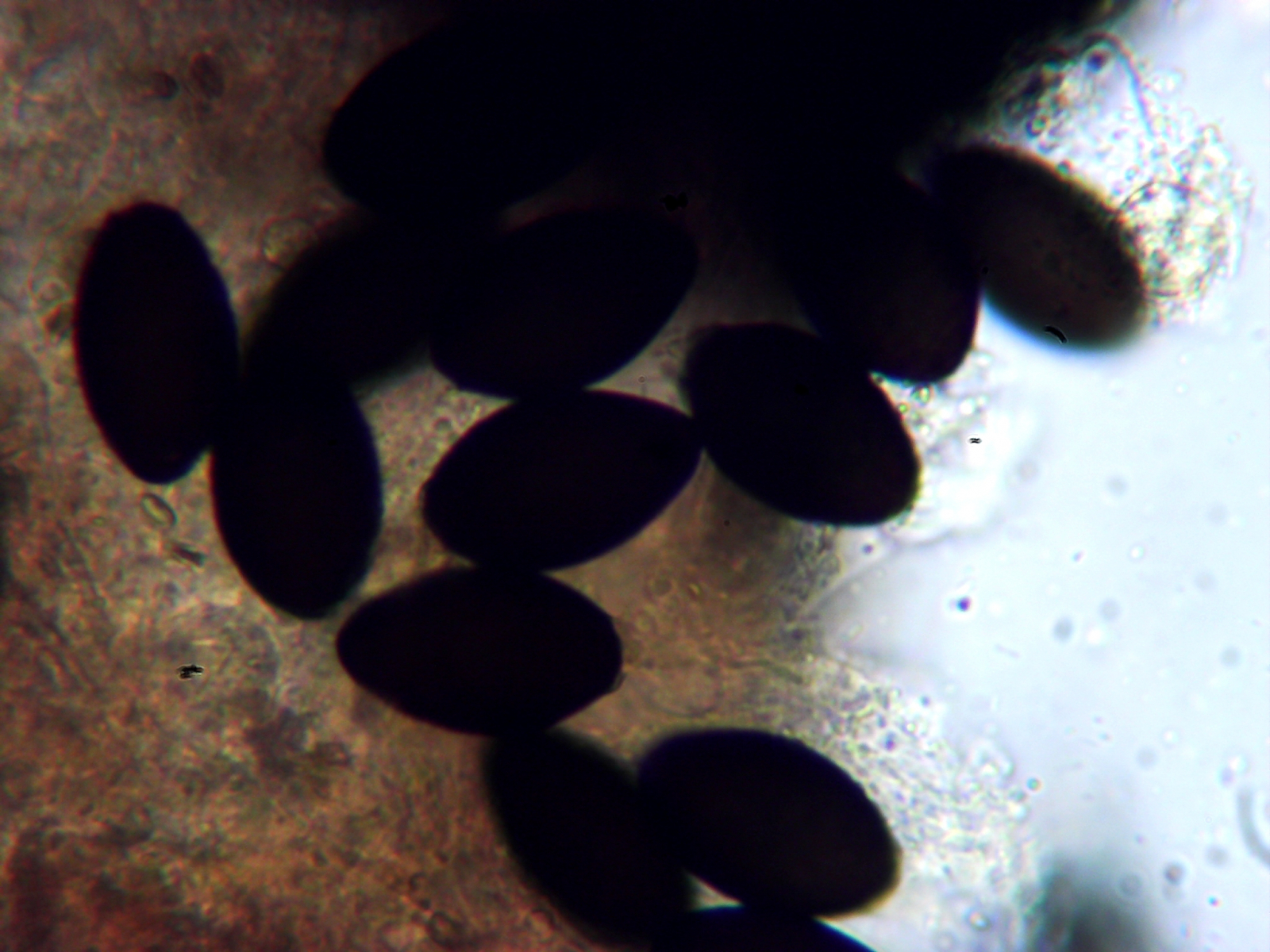 Die Schafe des Nachbarn haben mir auf ihren Hinterlassenschaften ein Schizothezium mit auffallend großen Sporen beschert. Leider habe ich die Fruchtkörper zwischen den anderen Arten zu spät entdeckt, so dass ich keine intakten Asci mehr zu sehen bekommen habe.