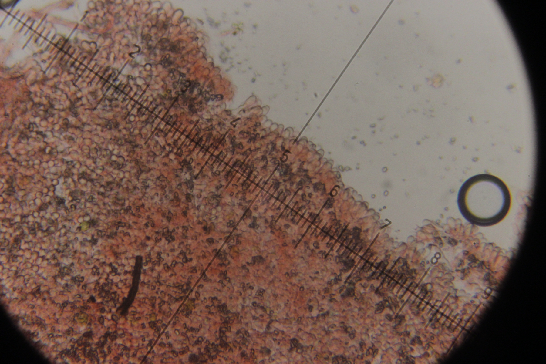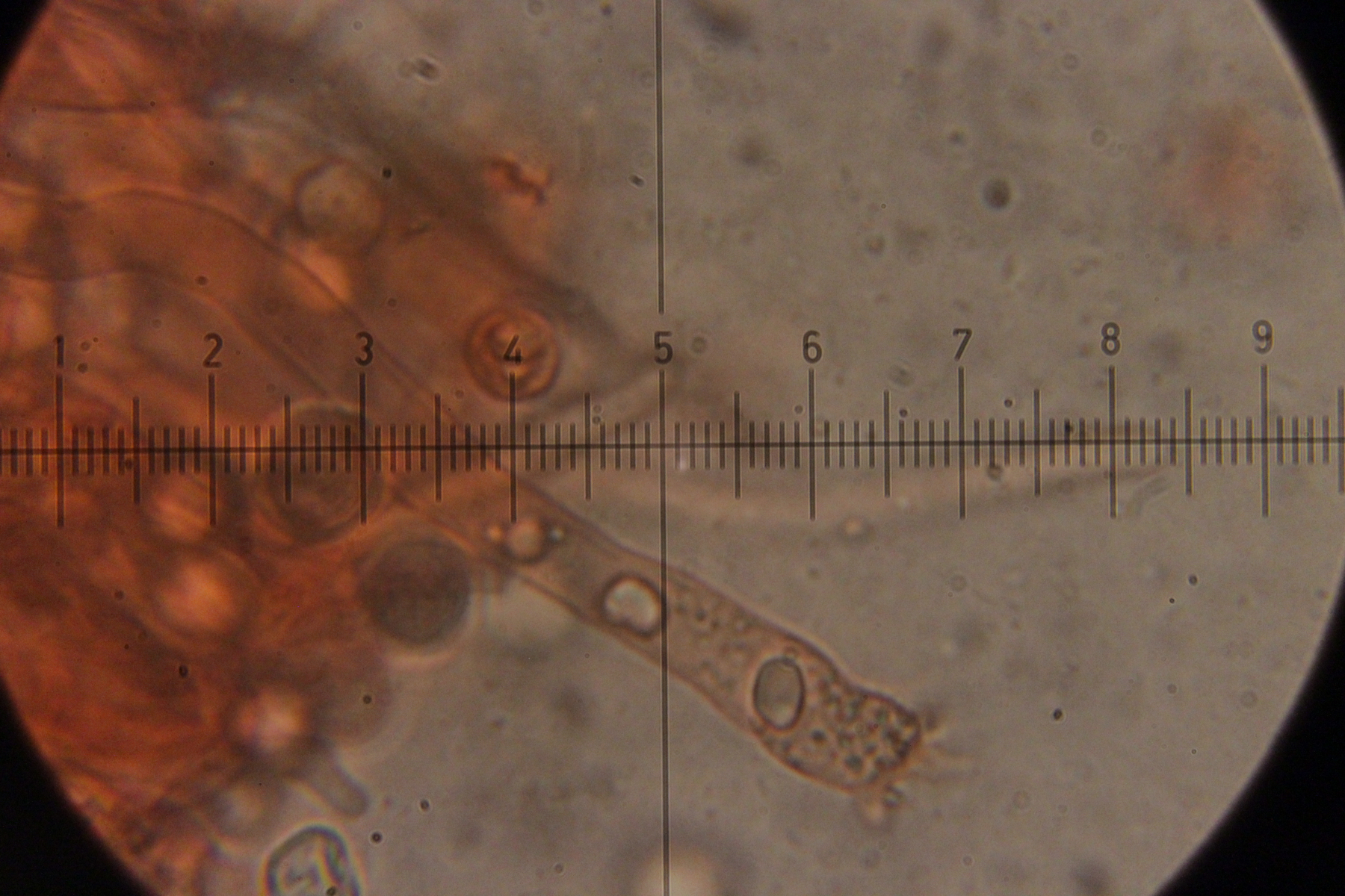 Da müsste man mal gucken, daß man welche an Basidien sitzend findet. Die Elemente auf dem letzten Bild hätte ich jetzt ebenfalls für Basidien gehalten? Das muss man vielleicht mehr im Überblick sehen, um die einzelnen Elemente direkter vergleichen zu können. Die Sporen könnte man mal in Melzer und in Baumwallblau angucken, Amyloidität ist ja immer wichtig und mir scheinen die irgendwie nicht glatt zu sein.