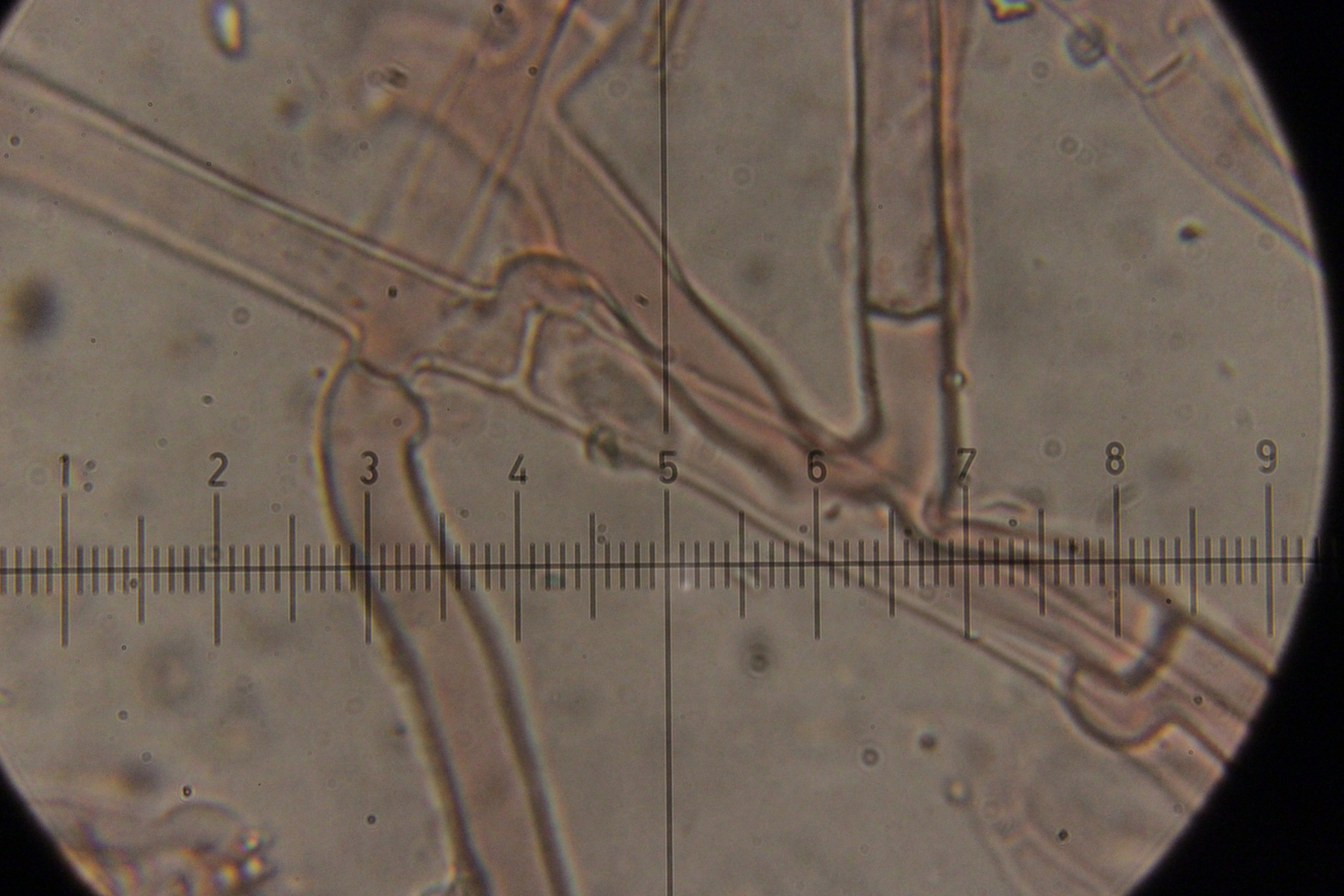Irgendwie scheinen die zahlreichen Sporen aber nicht identisch mit den Basidiosporen des ersten Bildes zu sein. Das würde dafür sprechen, daß man hier neben den Basidiosporen noch zahlreiche Chlamydosporen hat und es sich bei dem Pilz um Granulobasidum/Hypochnicium vellereum handelt.
